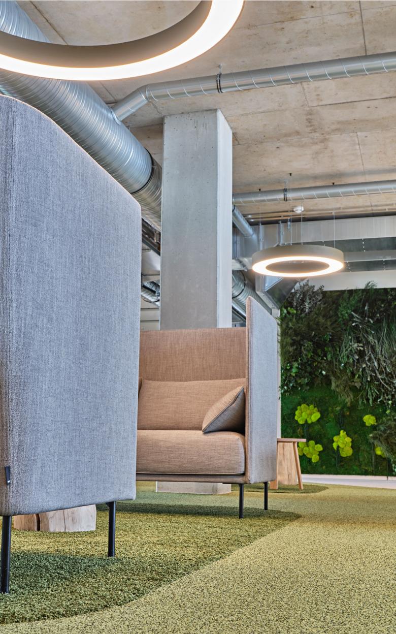 Die offenen Arbeitsbereiche und Wechselarbeitsplätze sind geprägt durch helle Farben. Niedrige Möblierung, Erdtöne und Textil dominieren die Open Space Bereiche und charakterisieren diese unter anderem durch die buschige Bepflanzung und moderne Arbeitsplätze.