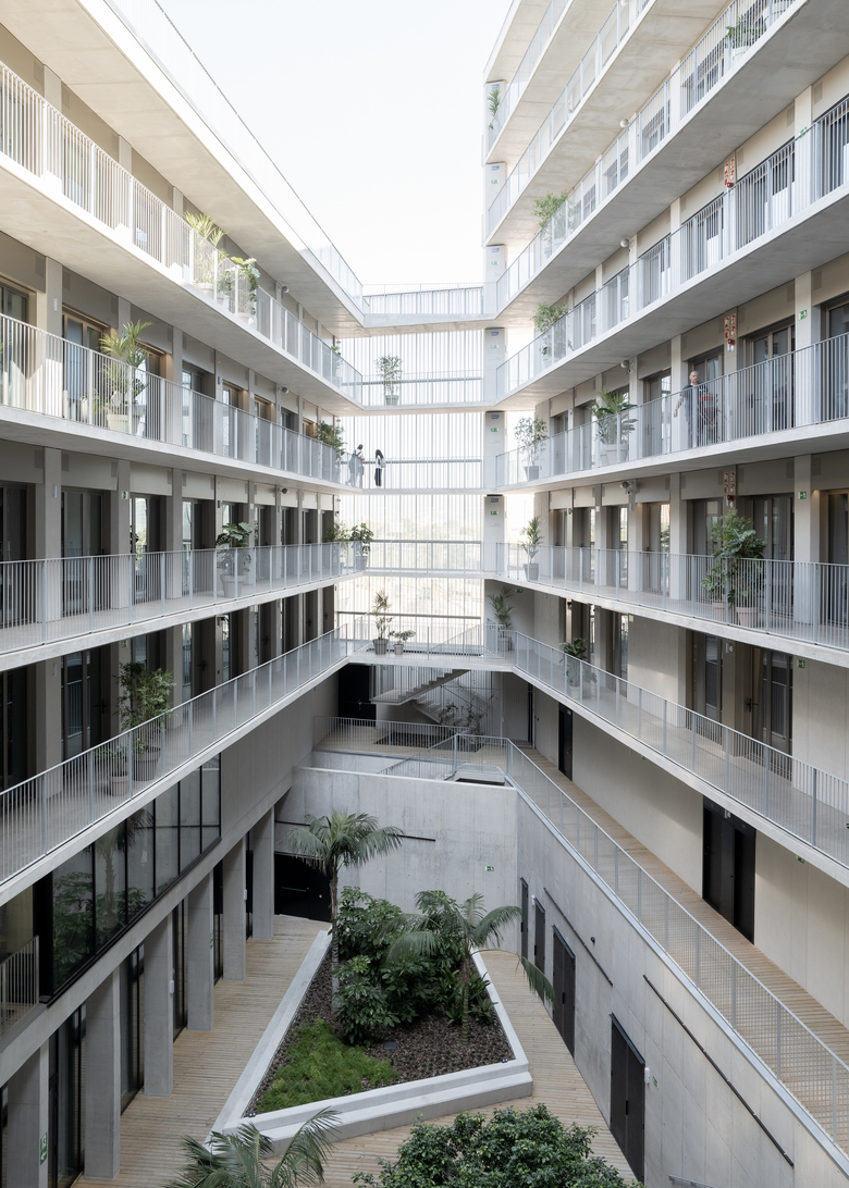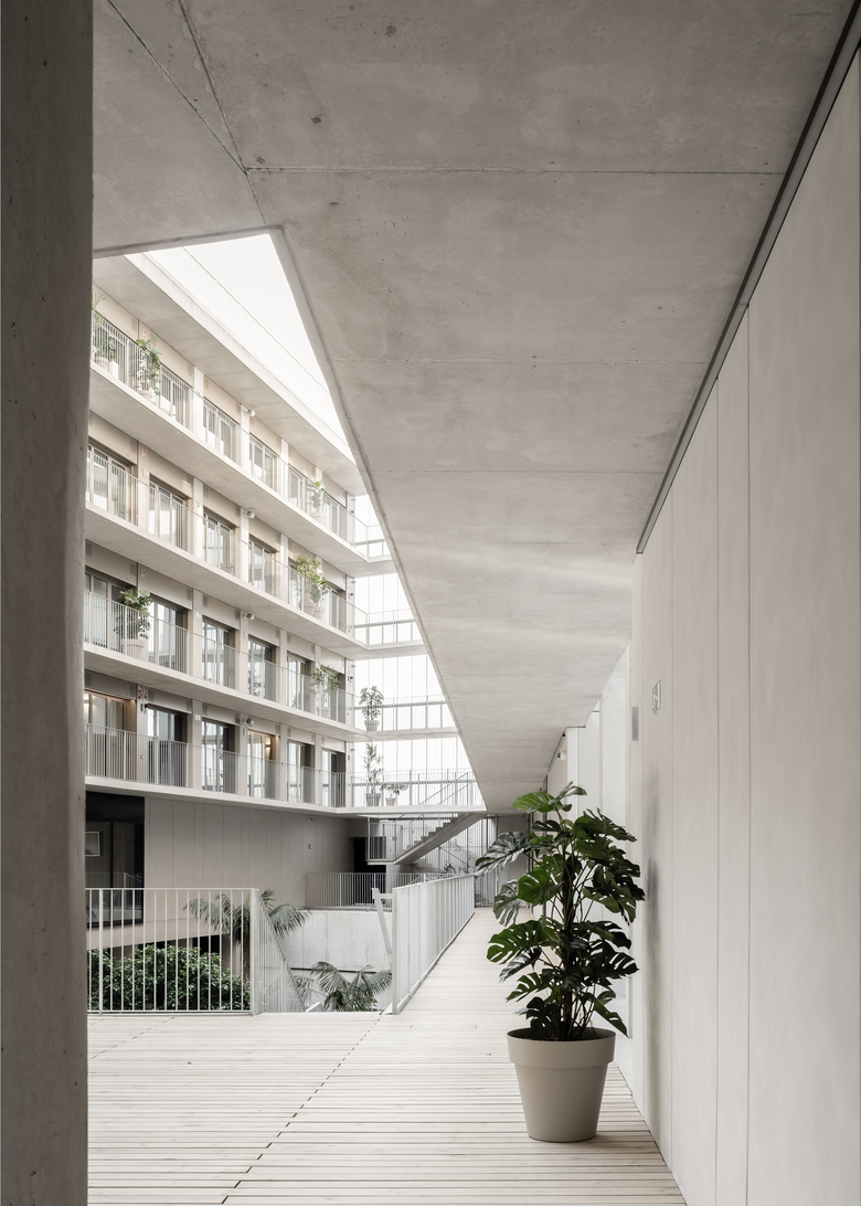 The building unfolds around a central green patio, allowing natural light to penetrate deep into its centre. The patio extends to the lower level and shields the building’s residents from the city noise. Imposed spatial limitations were converted into qualities. A cantilever on the second floor ensures a smooth alignment of the buildings along the Ronda Litoral. This results in an articulated building with an imposing plinth. Building heights limitations inspired the rooftop terrace. Interesting cross-sections invite a wide variety of horizontal, vertical, and diagonal perspectives.