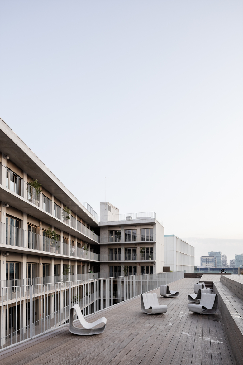 The fifth floor has an outdoor swimming pool and the eight floor offers an urban rooftop terrace with a sea view. The addition of community functions to residential life demonstrates the project’s social ambitions and effectively renders the Diagonal-Besós campus into a compact city within the metropolis.