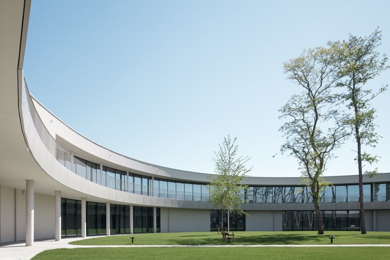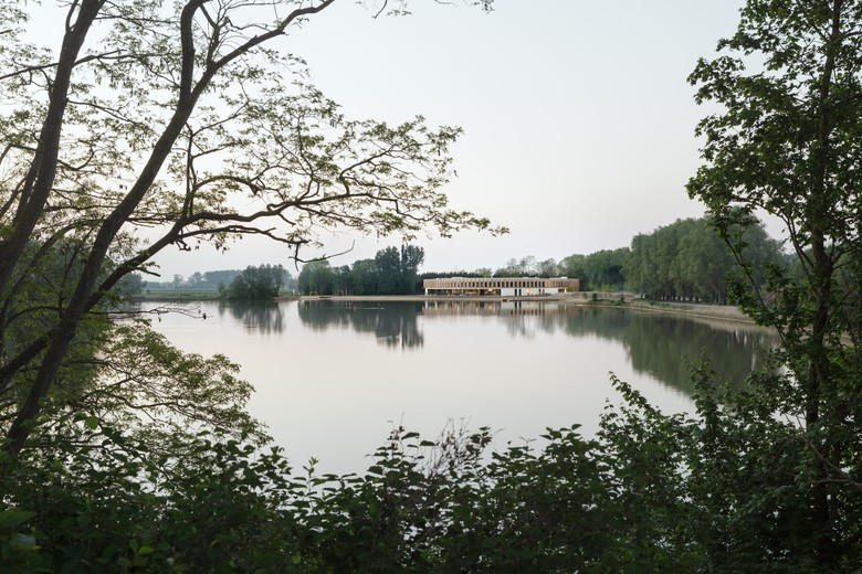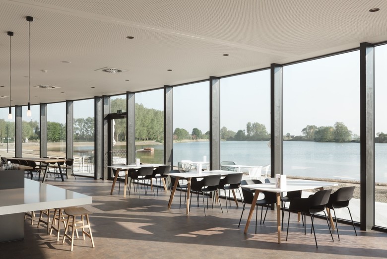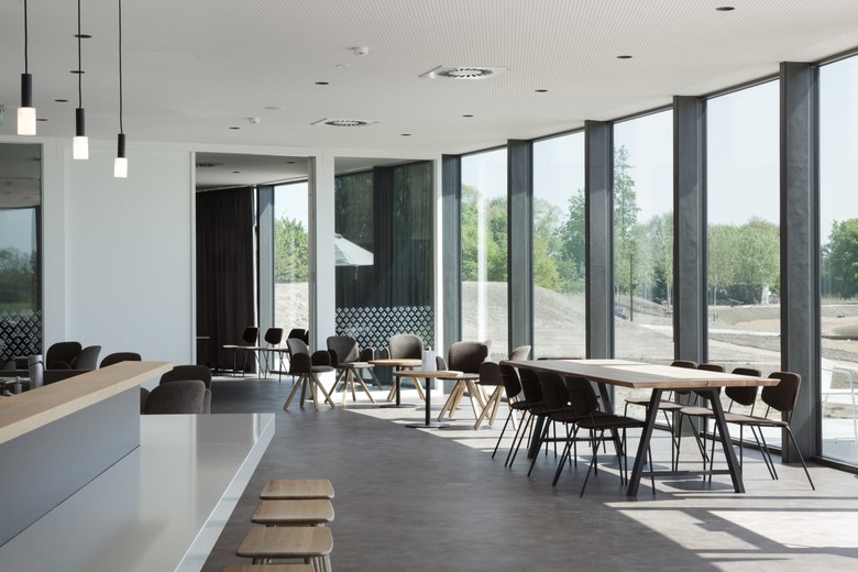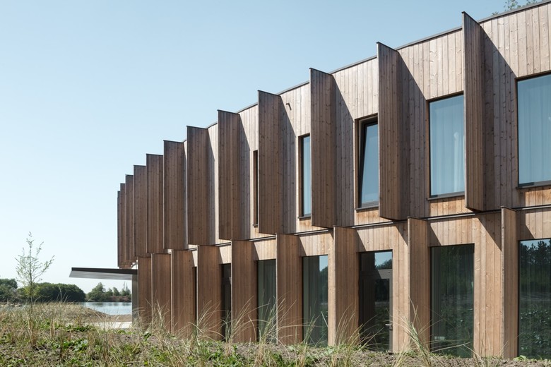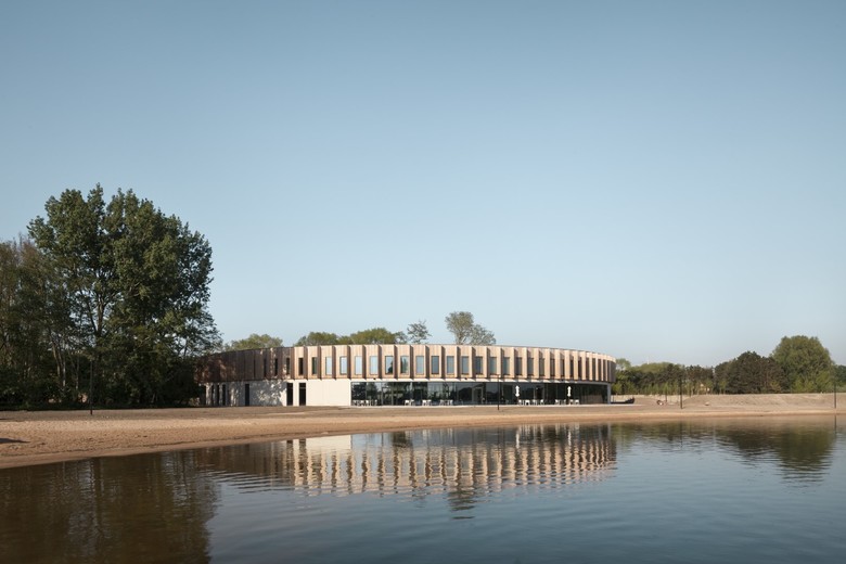 The Polderwind domain is located by a large lake in the rugged landscape of the West Flemish Polders. The circular volume – or rather, a stacked double torus with an uneven center – offers a 360° view of the wide surroundings. The low-rise building with wooden facades is a modest presence in the landscape.