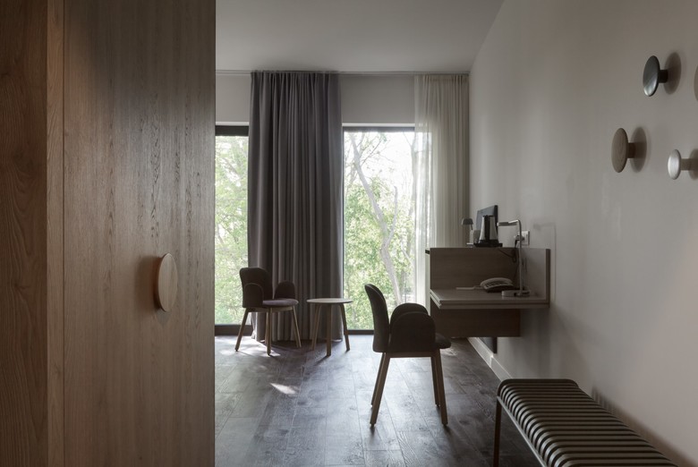 The hotel has an introverted and extroverted character, the duality of which is expressed in a very subtle way. The courtyard unfolds as an intimate place where you can retreat without hesitation. The public spaces are on the outside of the circle. There, the building fully opens up to its surroundings through the floor-to-ceiling glass sections. Where the three access axes are positioned, you can look completely through the building, from the domain to the inner garden.