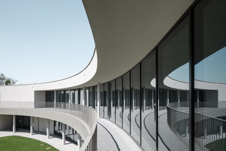 The circular volume encloses an inner patio where residents and visitors can find shelter from the sea breeze. The ground floor is openly accessible and transparent. A path cuts across the building. The public square and the common areas on the ground floor – like the cafeteria, the wellness area, and the fitness facilities – emphasize the social experience of going on vacation.