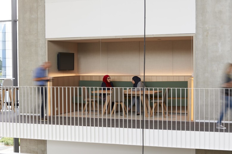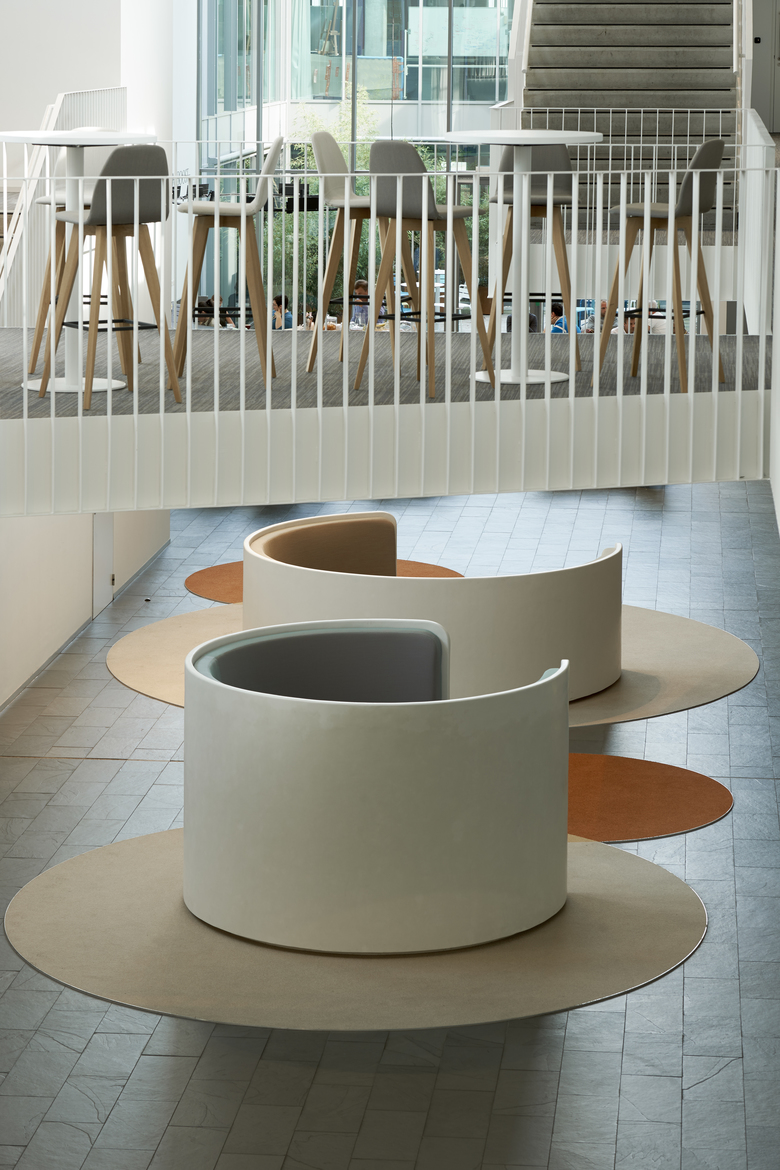 The atrium, with robustly spaced doorways and a roof lantern, is the building’s backbone and nerve centre. It provides access to the office floors and the car parks, and connects the existing office buildings. The atrium serves as a circulation area, foyer and conference room, and forms the vestibule to the offices. Its stairs, landings and hidden sitting areas facilitate informal contacts, chance encounters, brainstorming sessions and consultations.