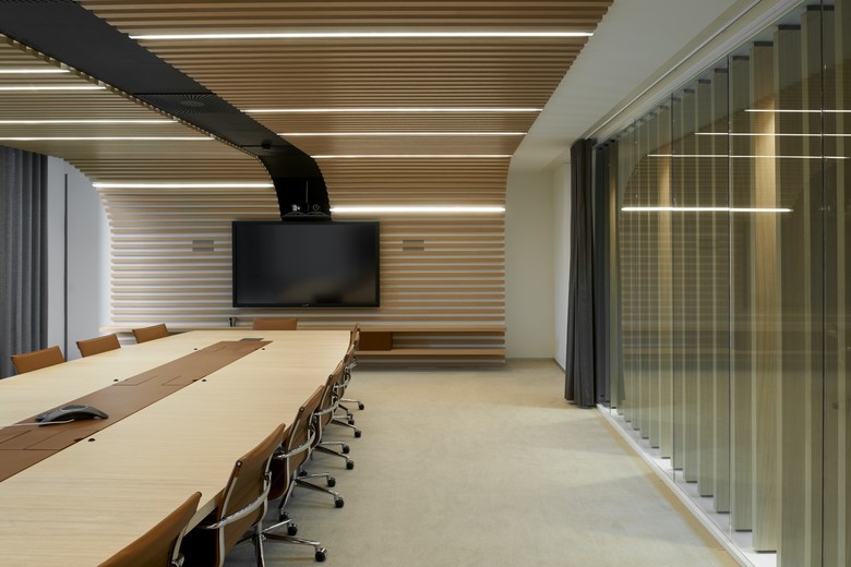 Cut-away sections and terraced patios draw daylight deep into the massive volume. Each of the patios has its own character. They are the recognizable anchors around which the company’s various departments can be clustered and structured. The set-up ensures an extremely flexible office environment. As departments or services grow or shrink, they can easily regroup around their epicentres.