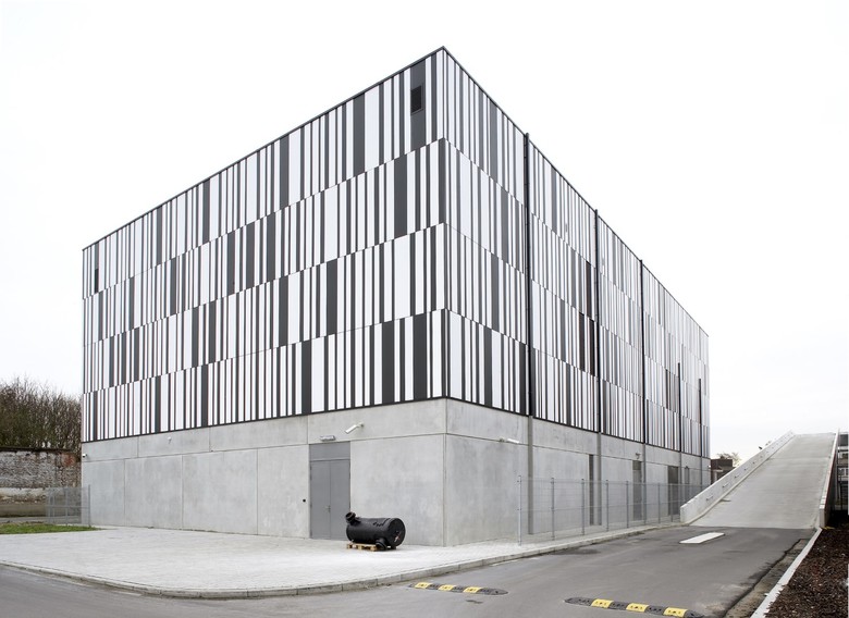 The new server facility lies beside the office building, set back from the street. The facade panels, which have to be closed, follow a random ‘binary’ pattern of black-and-white lines. The autonomous, abstract, near-iconic object is a counterweight to the ‘modest presence’. It is the very embodiment of the Telenet soul.