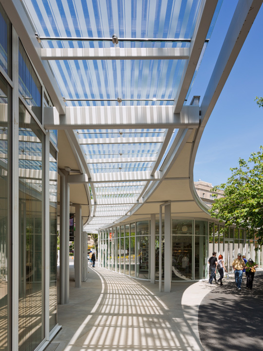 The design of the visitor center is seen as a seamless extension of the landscape. Nested into an existing berm, the center is experienced as a three dimensional continuation of the garden path system, framing a series of views into and through the garden. Sited at Washington Avenue, the visitor center wanders from the city into the garden, providing clear orientation and access to the major precincts. The visitor center includes an orientation room, information lobby, gift shop, exhibition gallery, cafe, and an elliptical events space.