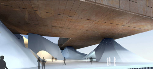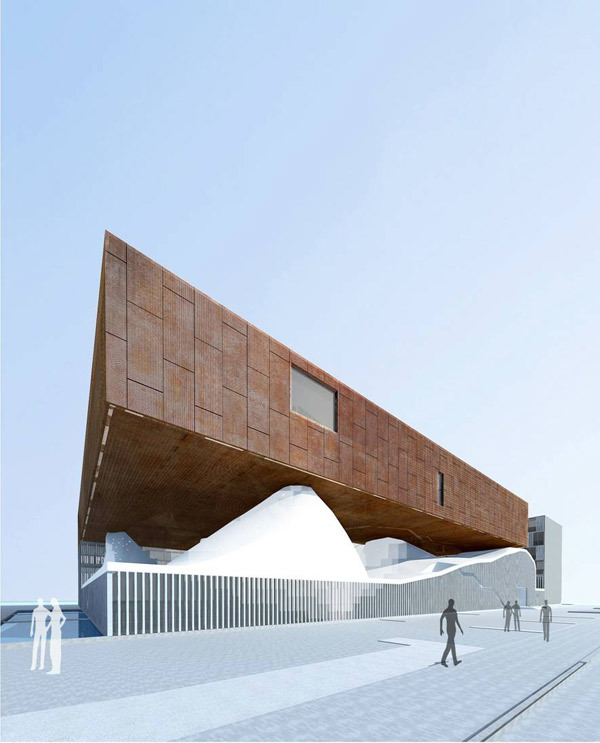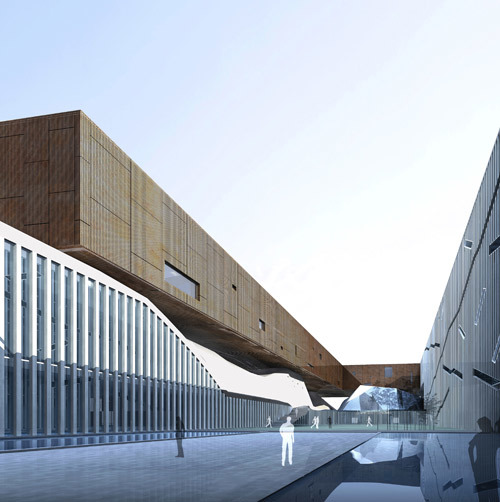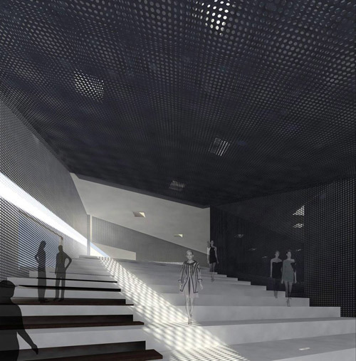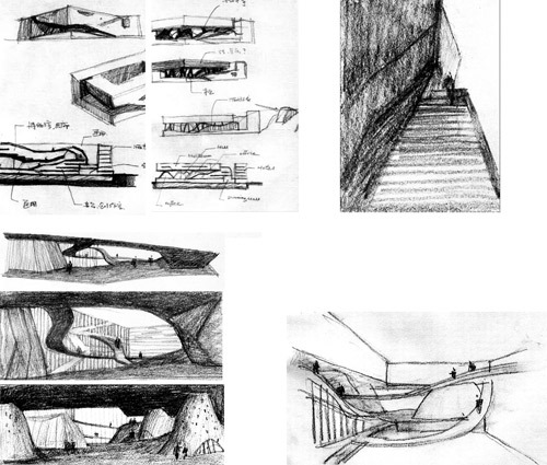 The building is organized based on two sets of L shape volumes. The east wing provides spaces for workshops, the south wing is the staff dormitory. The north-west block is divided vertically into three parts. The base is a space for sales exhibitions. The middle part is a semi-open area with some hill-shaped volumes as multi-function room and caf®¶. This is the place for events like fashion shows and parties. The L-shaped bar, flying at the top part, contains two areas of art exhibitions--- the Museum of Modern Art and the Museum of Fashion which is a floating space embedded in the L-shaped volume. From the entrance level, up to the open platform, "climbing" the hilly- roofs to the museum space, the passage makes a ritual expression for art and fashion.