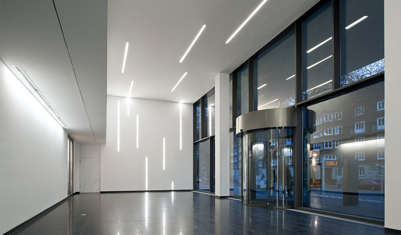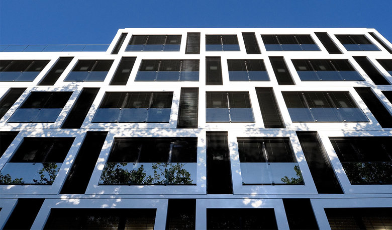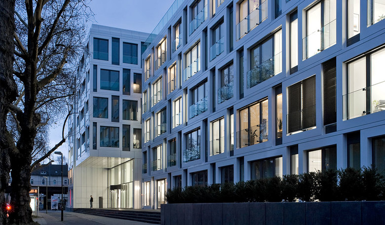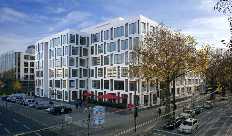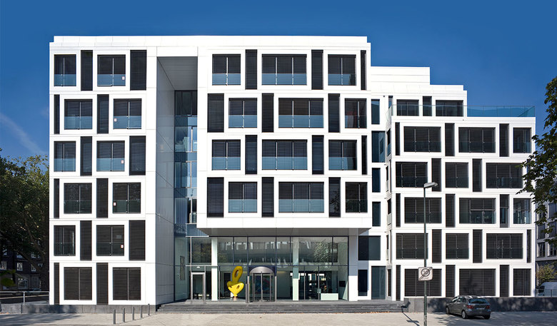 Das mehrfach ausgezeichnete Four Elements erzählt die Geschichte von der Städteplanung der 20er-Jahre: von Stadtraumzäsuren und Ideen für Plätze, die damals schon der Repräsentation dienten und einen optisch großzügigen Einlass in die Stadt boten. Four Elements greift die ursprüngliche Idee auf und stellt den öffentlichen Stadtraum im historischen Sinne und im Zusammenklang mit dem Denkmal gegenüber wieder her. Die kraftvolle Struktur der Fassade bricht bewusst mit allen Konventionen heutiger Bürofassaden. Gebäudezäsuren, Vor- und Rücksprünge ziehen sich konsequent durch die Gebäudegestaltung. Das räumliche Wechselspiel der überdimensionalen Fensterrahmen lässt ein überraschendes, expressionistisches Bild der Moderne entstehen, das in Interaktion mit der 80-jährigen Baugeschichte der gegenüberliegenden Wohntürme tritt. Die Spiegelung der zurückversetzten, einladenden Terrassenfreifläche stellt die legendäre Großzügigkeit des Stadtportals wieder her und belebt die historische Straßenecke mit stadtbekannter Szenegastronomie.