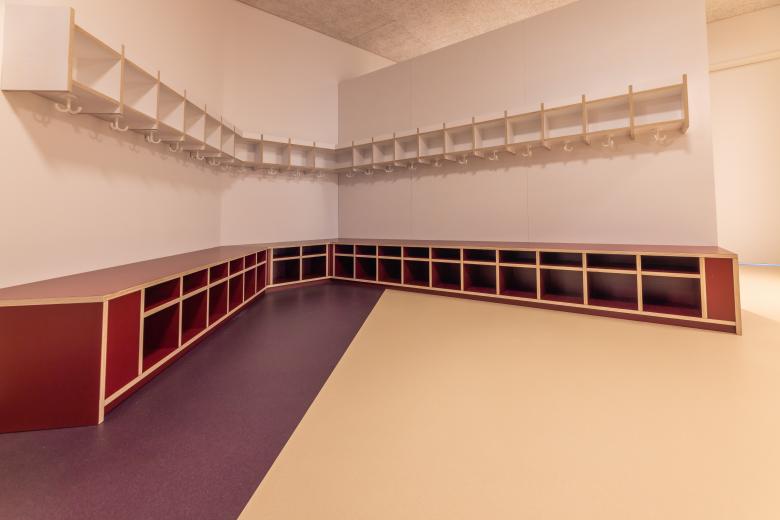 Die verschiedenen Bodenfarben wurden auch an Wänden und Einbauelementen angewendet und dienen Eltern und Kindern als Orientierungshilfe. Da sich die verschiedenfarbigen Bodenflächen über mehrere Räume erstreckten, war insbesondere bei der Vorbereitung viel Vorsicht gefragt. Mit viel Vorsicht wurden zuerst die Randpartien in der einen Farbe eingebaut und anschliessend auf die eingemessene Farbgrenze zurückgeschnitten. Im Anschluss wurde der bereits eingebaute Teil abgedeckt und der mittlere Teil des Bodens mit der zweiten Farbe eingebaut.
