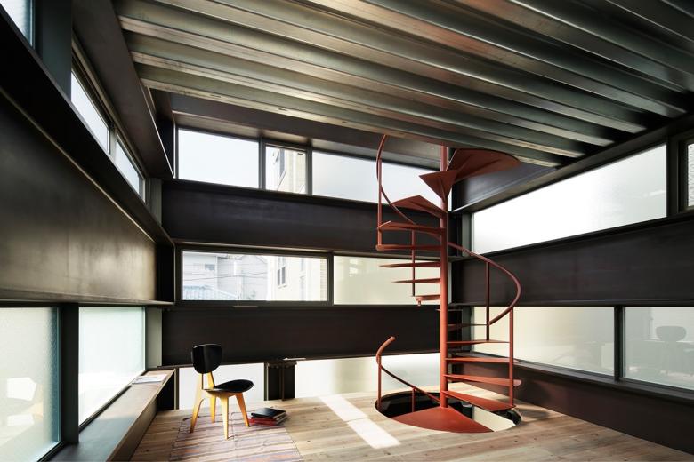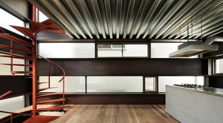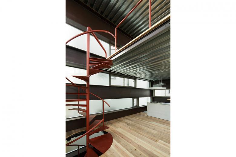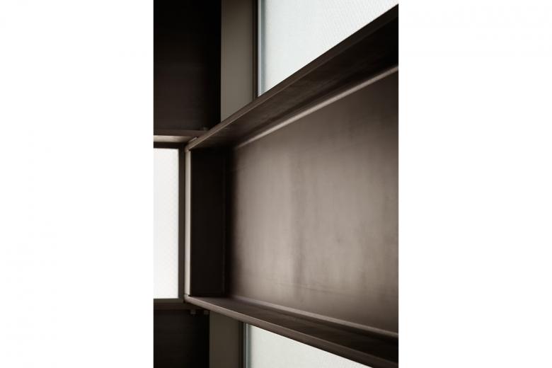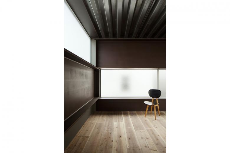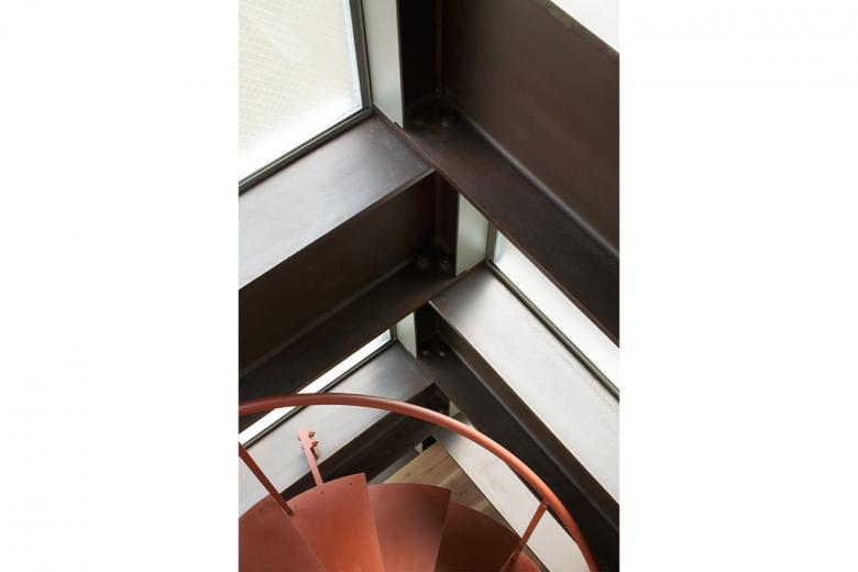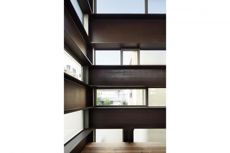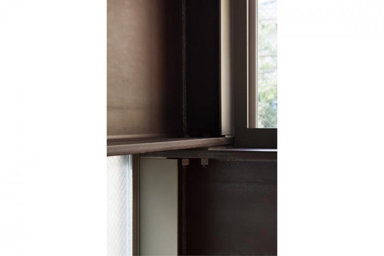 We chose this 'log house' style when it came for us to design a house for a couple on a site in a corner of very commonplace newly-developed housing lots in Metropolitan Tokyo. But here the log house is made of H-steel with a large section 700 x 350 x 16 x 25(mm) mostly used in construction of large scale buildings, in stead of round timber. H-steel's 'material properties' such as enormous weight and strength, mathematical regularity distinctive of roll-milled H-steel, and gentleness expressed in rounded corners, were assembled into a log house shape and intensified/amplified in an attempt to furnish a desirable 'locality' to a featureless,newly-developed residential area.