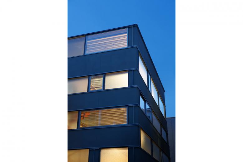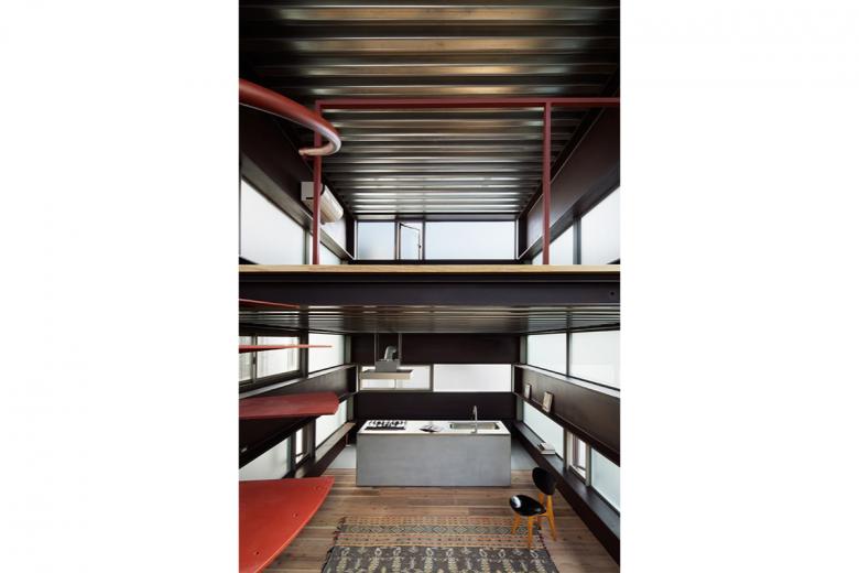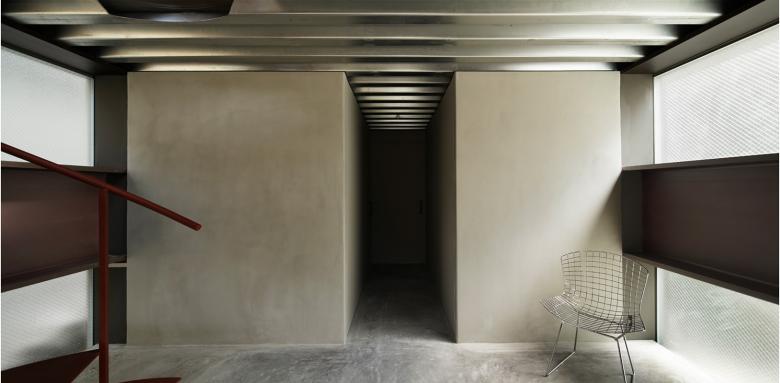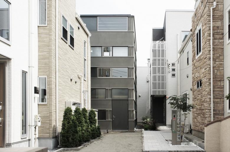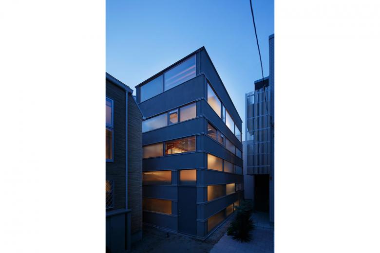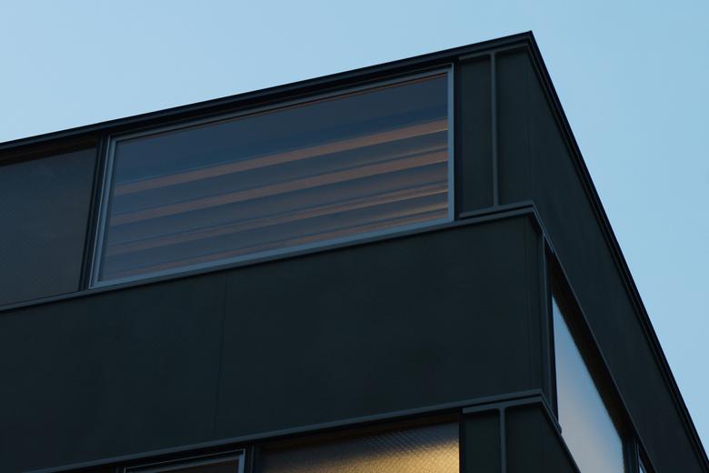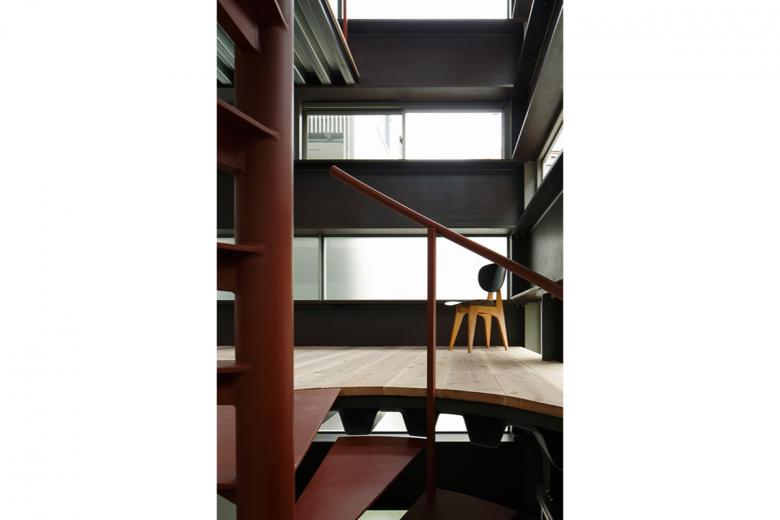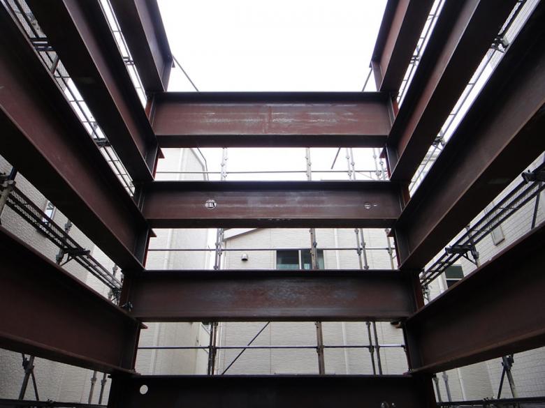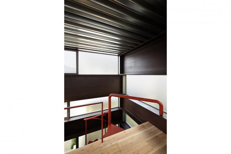 We chose this 'log house' style when it came for us to design a house for a couple on a site in a corner of very commonplace newly-developed housing lots in Metropolitan Tokyo. But here the log house is made of H-steel with a large section 700 x 350 x 16 x 25(mm) mostly used in construction of large scale buildings, in stead of round timber. H-steel's 'material properties' such as enormous weight and strength, mathematical regularity distinctive of roll-milled H-steel, and gentleness expressed in rounded corners, were assembled into a log house shape and intensified/amplified in an attempt to furnish a desirable 'locality' to a featureless,newly-developed residential area.