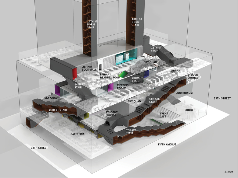 Conceived as a campus within a building, the University Center transforms the traditional university environment. Rather than compartmentalize learning, living, dining, and socializing spaces, these functions are situated in a vertical configuration, creating strategic adjacencies and heightening the university’s commitment to interdisciplinary learning. Connections between classrooms, studios, library, cafés, auditorium, and student residences take the form of stacked staircases and “sky quads” that facilitate the chance encounters vital to the cultivation of discussion and debate at The New School.