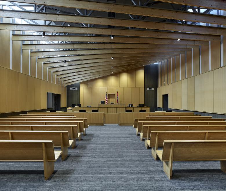 The City of Springdale has limited and finite resources for building and maintenance of the project. The programming planned for and included space for 20 years of growth in the project. The design solution had to be economical and exhibit both long-term flexibility for office areas and durability for public use areas. The exterior combined brick and precast concrete skin. The precast panels are shaped to be an active light and shallow changing surface. The goal is to utilize an inexpensive material and achieve civic presence with a dynamic pattern of light and warm and cool shadows. Interior materials include ground-face concrete block walls, polished concrete floors, and exposed painted steel. The three civic rooms; the council chamber, the courtroom, and the police training room are each upgraded with natural light, a view of the park and city, and adorned with acoustic wood paneling and oak-trimmed steel trusses.