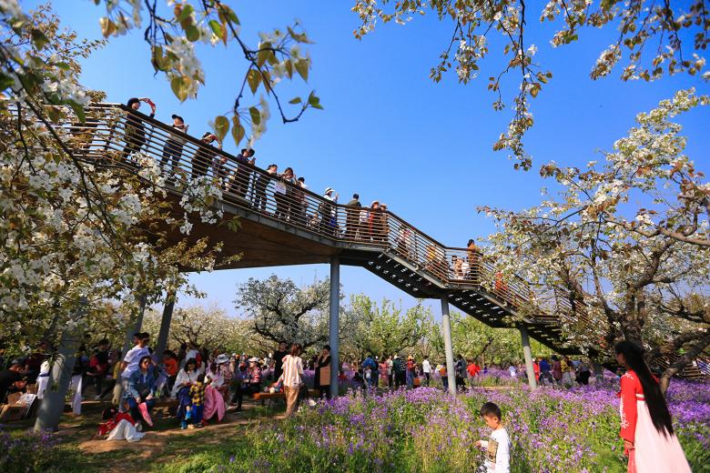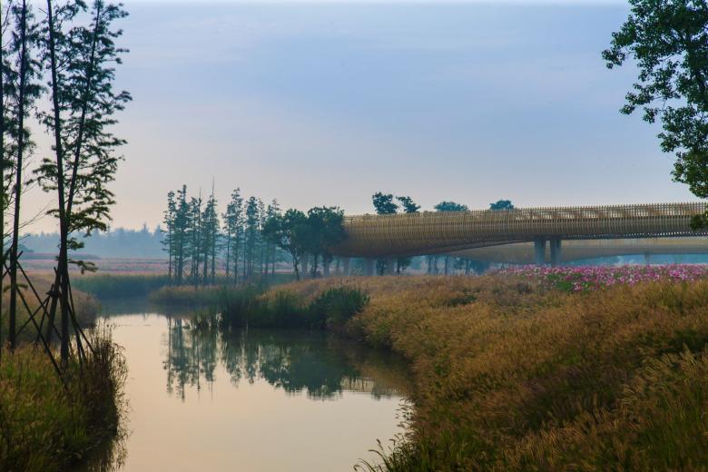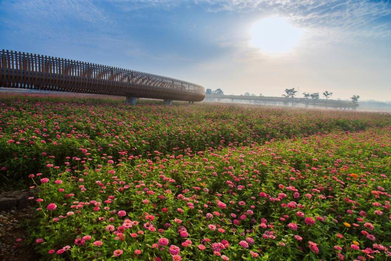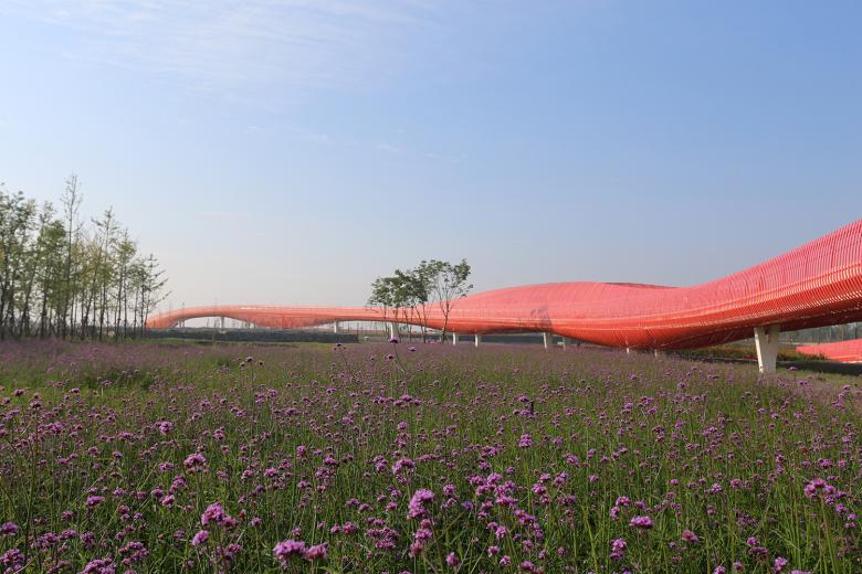 In a new urban development district, a park, called Santai Shan Forest Park, was planned as a catalyst to transform the poorly managed suburban landscape and enhance the land value surrounding the site. The strategy is a patchwork of flowers. The project celebrates the vernacular landscape of fields, orchard, forests and water features in the existing situation. The designer made use of the subtle terrain and has created terraces of fields and transformed them into a patchwork colors of meadows and productive crops. A touring route and a network of pedestrian connect the designed and exiting landscape elements together, and a skywalk is elevated above the filed allowing visitor to experience the extensive fields of colors. Pavilions and resting structure are allocated all through the landscape. In just 5 months after its opening from May till October of 2015, two millions of visitors had been attracted to the park. The goal of creating an activating the suburban district through an inexpensive landscape strategy has been fulfilled successfully.