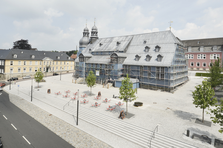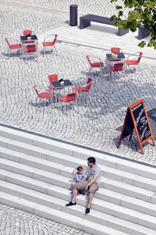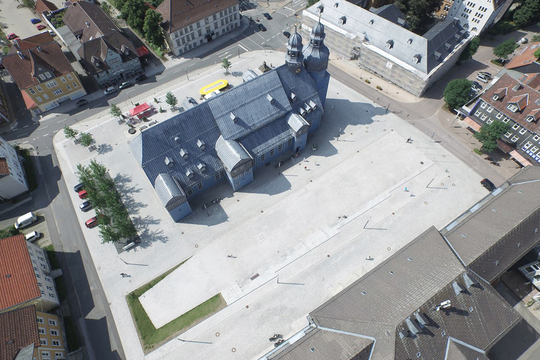 The Marktkirchplatz has a distinctive topography, which has been adapted in different phases to the respective needs of the time. These changes should be largely dismantled to allow a new terrain modeling, which is based close to the original profile. The court surface is restructured and applied with uniform textures that simultaneously enables differentiated uses of the area. Seat Steps and stairs mediate between the layers, thus forming a recordable topography.