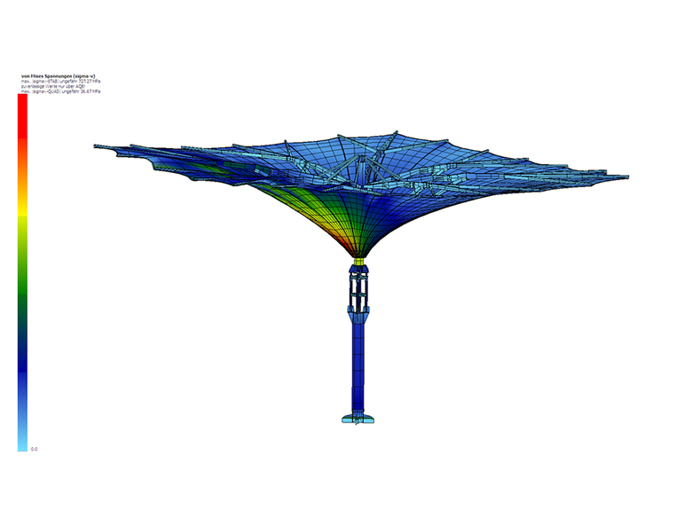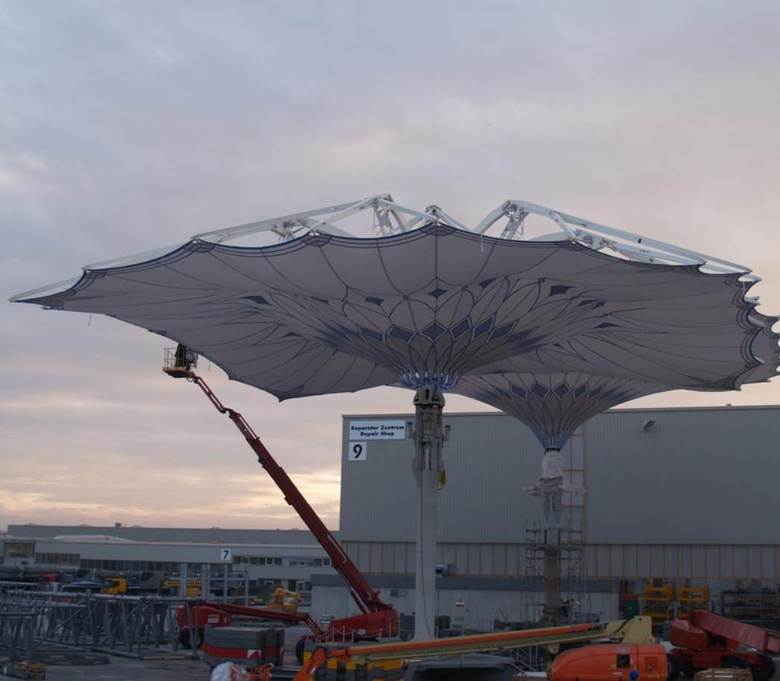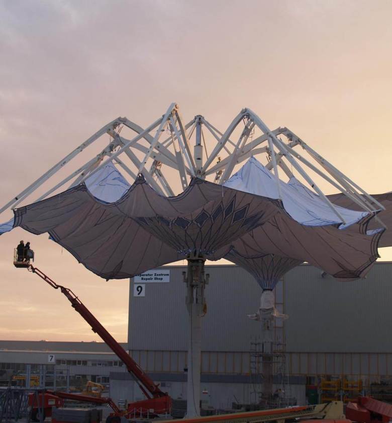 The outside areas of the Prophet’s Mosque in Medina are spanned by 260 parasols. The total spanned area amounts to 145,000 m². The height of the parasol constructions, when open, is 21.70 m – whereas the size of the pre-stressed parasol membranes is 26 x 26 m each.