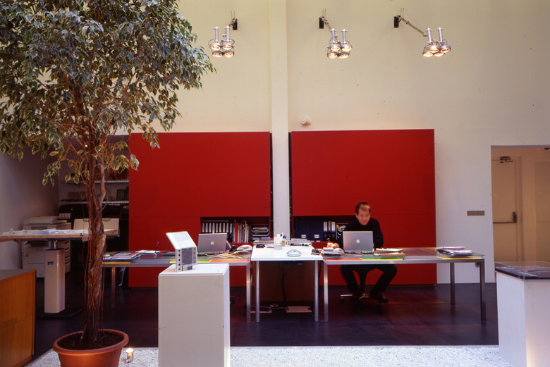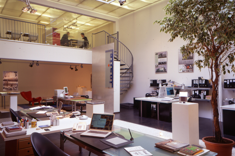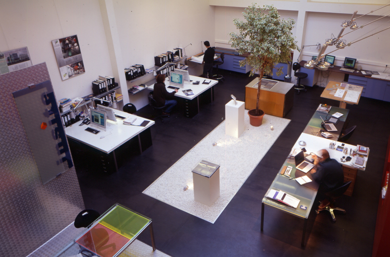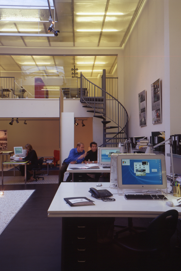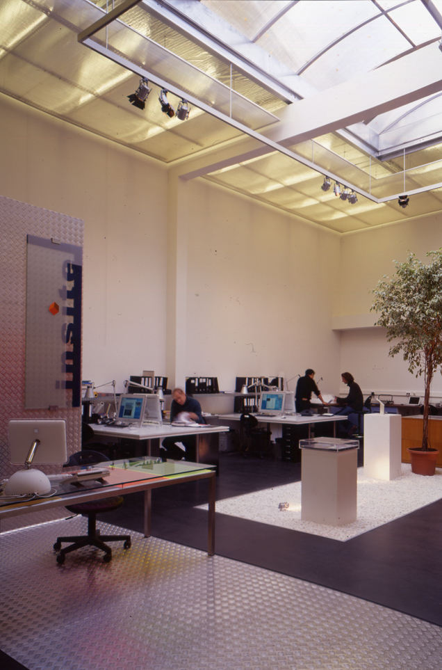 Transformation of an existing photographic atelier located in the basement into a luminous creative design studio with meeting lounges, transformable workstations, and café.