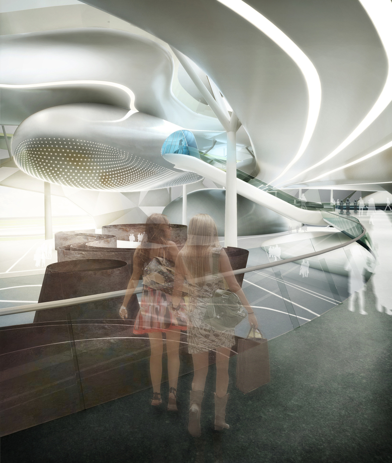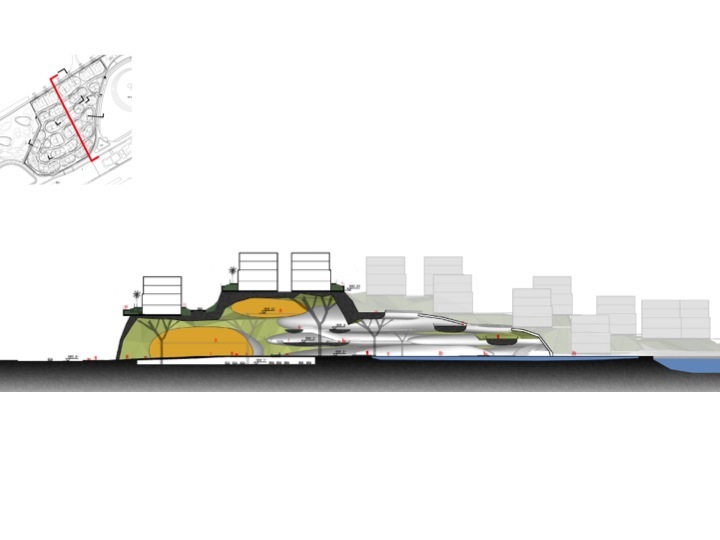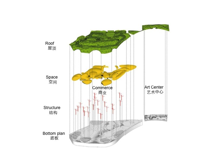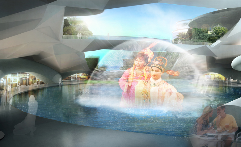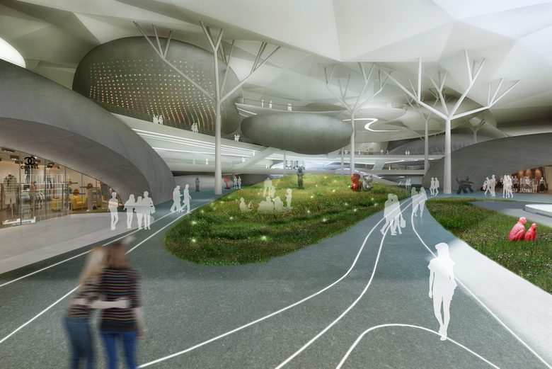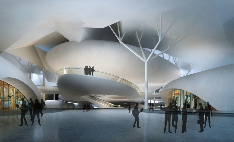 Situated on the resort themed island, Phoenix Island, the Leisure-Commercial -cultural centre is designed to be the main destination point for tourists and locals alike offering a unique experience in mixing art and shopping, commercial art venue with family leisure and entertainment with culture. The project located underneath a large high end resort villa development, is a space carved out from inside an artificial mountain. Retail,exposition spaces and cineplex are designed as a series of pods that are overlapped on top of one another creating a series of interconnected interstitial spaces. These interstitial spaces provide pedestrian circulation and opportunities of pop up expo spaces that accompany pedestrians.