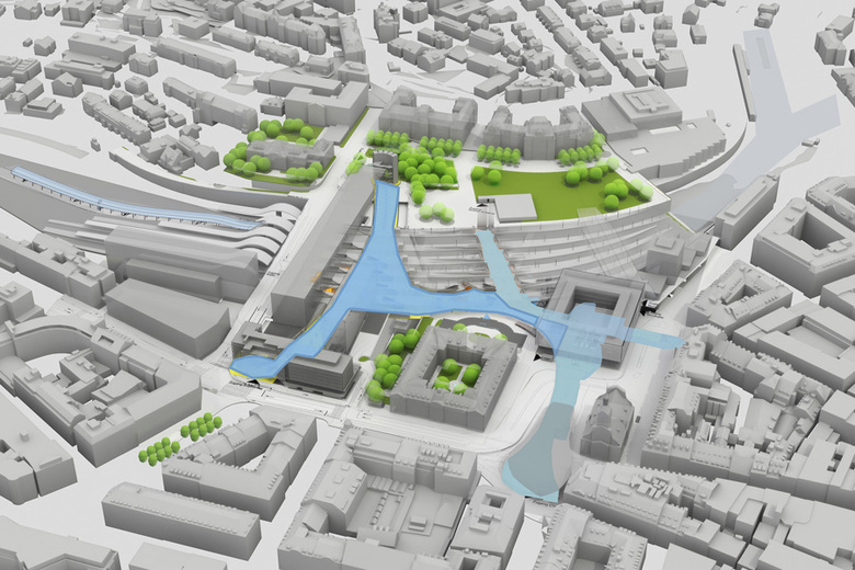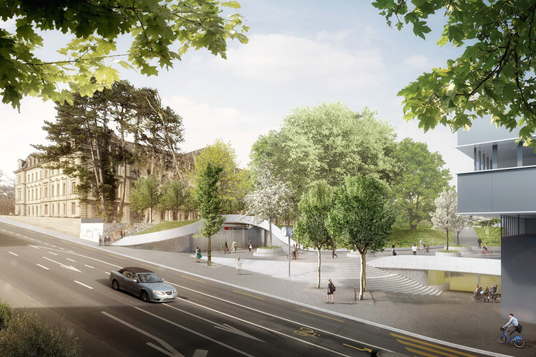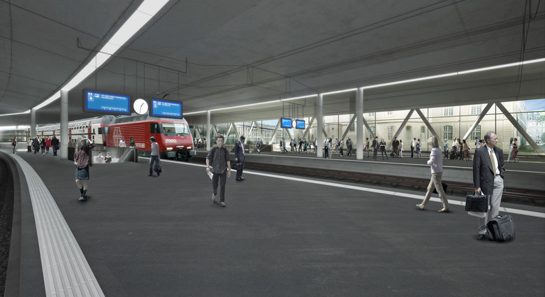 Bern’s Central Station public facilities expansion project consists of multiple interventions that will upgrade the facility, which has reached its peak capacity and safety limits. A new central passage forms the heart of the expansion. The spacious facility is flanked by 2’500 m2 of catering and retail space, making it an enjoyable experience. New access points include the Länggasse entry to the north, complete with bike station, and the Budenberg entry to the south which integrates the station with the urban fabric of the city. The new RBS Underground Station will be centrally connected to the new public facilities above. The glazed southern wall of the platform will allow passenger orientation, as well as provide a experiential arrival into Bern. The implementation of this complex project is taking place without disruption of ongoing rail service at the station.