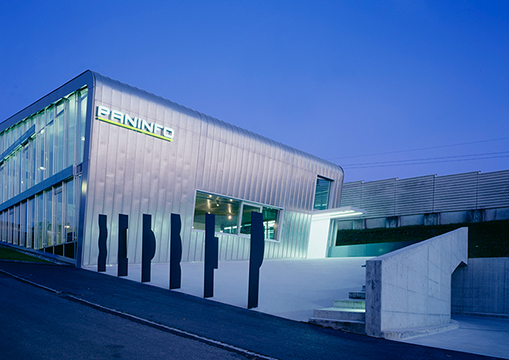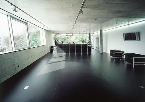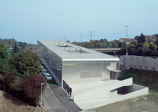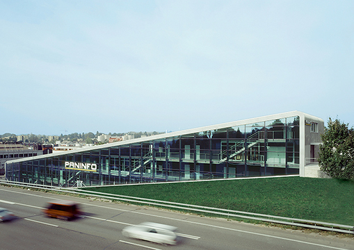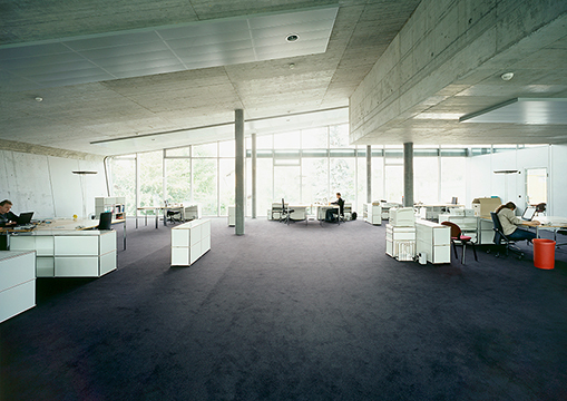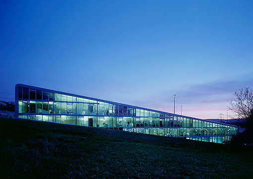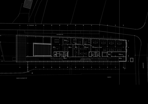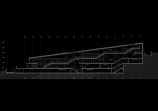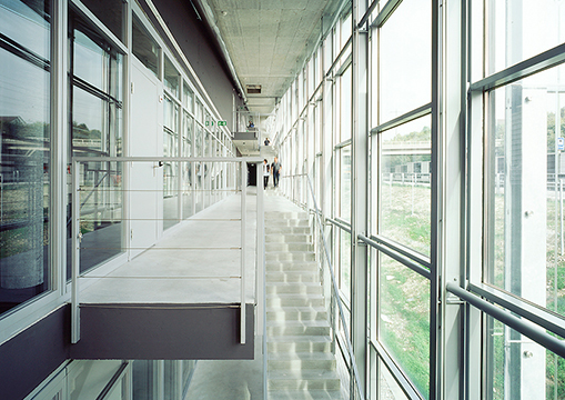 A four-story office building located prominently along a motorway. Running parallel to the sloping topography, the building functions as a noise barrier, and utilizes a buffer zone within for services and a cascading staircase.