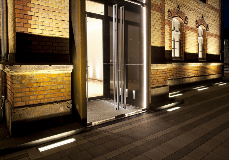 On »Robert«, Lightlines integrated in the façade, guide the viewer’s eye to the entrance area of the so called Saarhaus of the former Ulan Barracks. Wallwashers, whose angles can be individually chosen, illuminate the old walls from below. LED Drainlight was selected for this: The stainless steel housing has a glass cover to ensure that neither dirt nor withered leaves can affect the radiant power of the illuminants. From a practical point of view: When – someday – the long-lasting illuminants need to be replaced this can be done in just a few simple steps. Internal metal channels ensure that condensed water and rainwater can drain away easily.