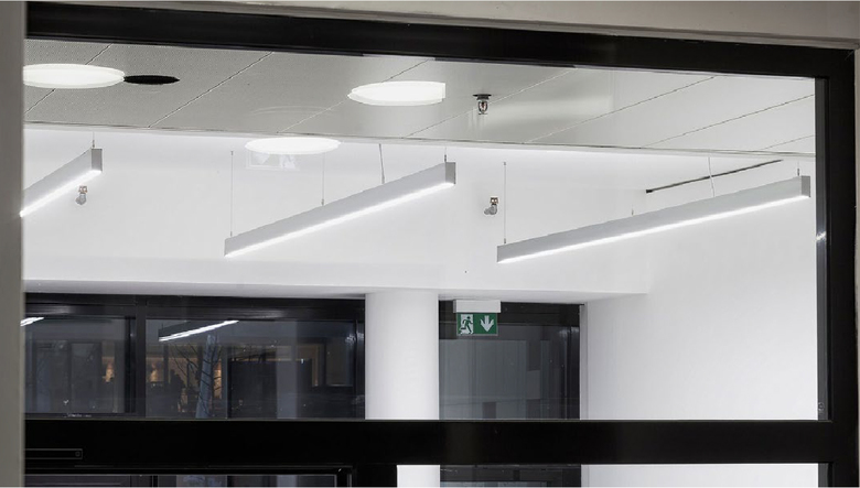The newly created offices were equipped with the LED Around. As a pendant luminaire it lights conference and meeting rooms, offering both, a slim minimalist aluminium profile and a high-quality finish. Switched off, the illuminant appears transparent and thus has a light and airy appearance. Microprisms embedded in the glass may be visible as tiny dots. Switched on, LED Around provides a pleasant, homogeneous light, 40 per cent being emitted upwards and 60 per cent being emitted downwards. The luminaire is infinitely dimmable, a big advantage, for example, when using a beamer for presentations.