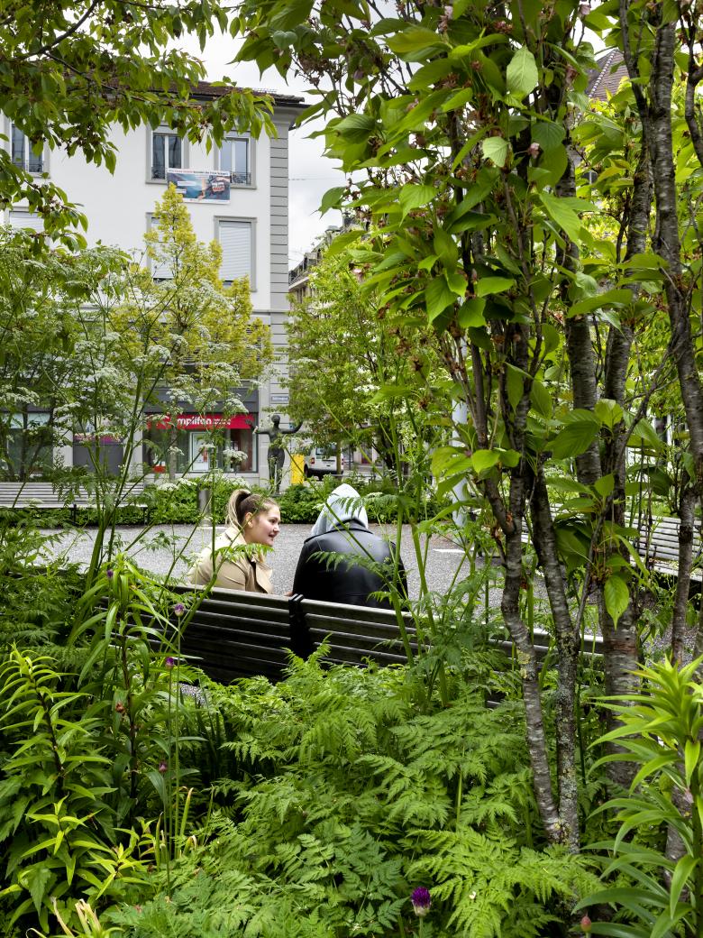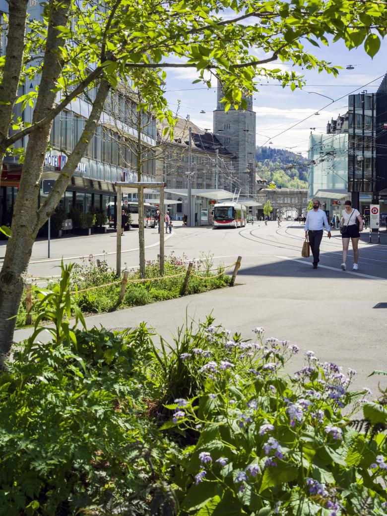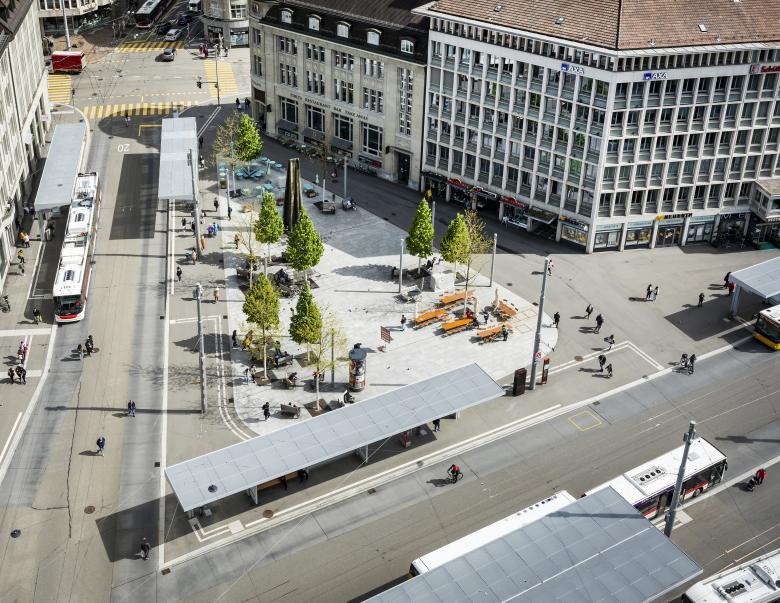 Aufgrund der neuen, kompakten Organisation des öffentlichen Verkehrs konnten wir grosszügige Platzräume mit unterschiedlichen Aufenthaltsqualitäten schaffen. Der Kornhausplatz lädt als grosszügiger Stadtplatz und zentraler Begegnungsort mit Natursteinbelag, Lämmlerbrunnen sowie Sitzbänken und Restaurants zum Verweilen unter den neu gepflanzten Bäumen ein. Gleichzeitig bleibt ausreichend Platz für temporäre Events. Die direkt auf das historische Aufnahmegebäude hin führende Gutenbergstrasse wurde zur Fussgängerzone umgebaut. Das mit Stauden und Kirschbäumen gefasste Bahnhofpärkli im Osten bildet inmitten der Verkehrsflächen eine grüne Oase und ist Ausgangspunkt für die Allee entlang der Poststrasse, die Fussgänger und öffentlichen Verkehr am blühenden Grabenpärkli vorbei in die Innenstadt führt. Am nördlichen Ende der neuen Personenunterführung-Ost entstanden zwei kleine Plätze zum Verweilen und als Entrées zum Bahnhof. Die Neuorganisation des Bahnhofs St.Gallen wurde mit dem Schweizerischen Mobilitätspreis FLUX 2019 ausgezeichnet.