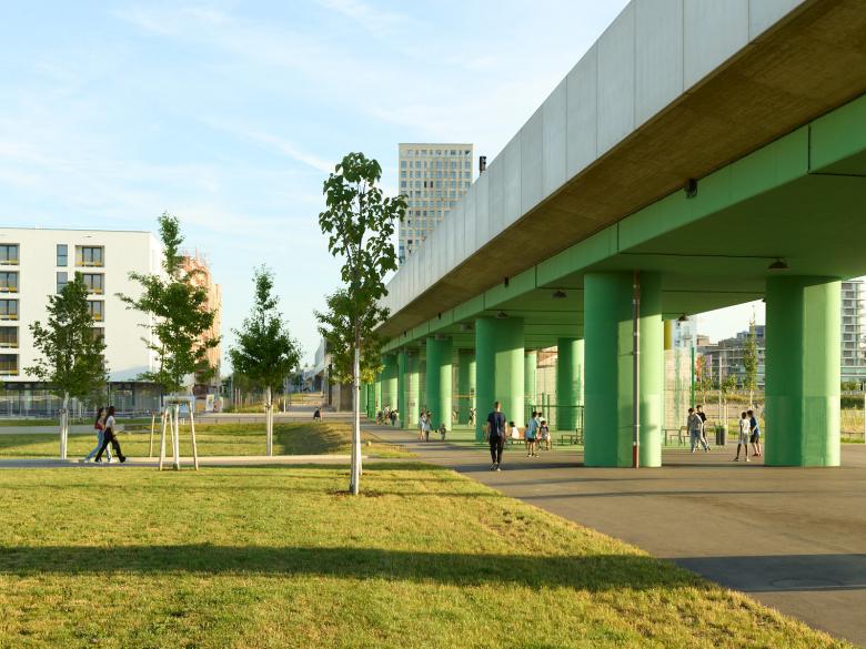Bei der Ausarbeitung des Parkkonzepts haben wir besonderes Gewicht auf die funktionale Einbindung der Hochbahn gelegt. Der Bereich unter der Bahntrasse soll als geschützter Raum mit verschiedenen bewegungsorientierten Nutzungen aufgeladen werden. Hinter jeder Aktivität stehen Gruppen von Nutzern und Nutzerinnen, die bereits vor dem Wettbewerb in den Planungsprozess eingebunden wurden. Die Palette reicht von Trendsportarten wie Bouldern und Parcours bis hin zu einem über einen privaten Träger angebotenen Fahrradspielplatz. Mit den Sportangeboten für die benachbarte Schule (Streetball, Sportfelder) werden die privaten Trägerschaften um ein Angebot der öffentlichen Hand erweitert. Dem aktiven Nutzungskanon unter der Hochbahn stehen flexibel bespielbare und ruhige Bereiche im Parkraum gegenüber. Im Rahmen von öffentlichen Befragungen und diversen Informationsveranstaltungen wurde das Programm des Parks mit den Bedürfnissen der Anwohner und Anwohnerinnen abgeglichen. Die gemeinsam erarbeiteten Ideen wurden bereits im Wettbewerbsentwurf berücksichtigt und in der späteren Planung ergänzt und weiter ausgearbeitet.