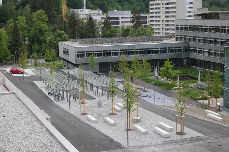 Das denkmalgeschützte Schulhaus aus den 1960er Jahre hat nach seiner Sanierung einen neuen Freiraum mit einer vielfältigen Abfolge von Nutzungen erhalten. Neben den offenen Eingangsplätzen und den weiten Wiesenflächen haben wir die Sitzlandschaft und den Schulgarten ins Zentrum der Anlage gelegt, die Pausenhof und Unterrichtsraum zugleich sind. Der Schulgarten ist in Themengärten gegliedert, die als willkommene Inspiration für den Unterricht dienen. Die neue Mensa und Mediathek schmiegt sich an die bestehende Felswand. Im spektakulären Raum zwischen Gebäude und Felswand liegt ein introvertierter Aufenthaltsbereich. Eine markante Stahltreppe führt zum Konvikt der Kantonsschule empor. Die grosszügige, auf die Themengärten ausgerichtete Sitzlandschaft lädt zum Verweilen und Schauen ein. Ein durchgehendes Blätterdach aus locker angeordneten Eichen rahmt die Anlage, bindet sie in die Umgebung ein und verleiht ihr einen einheitlichen Charakter.