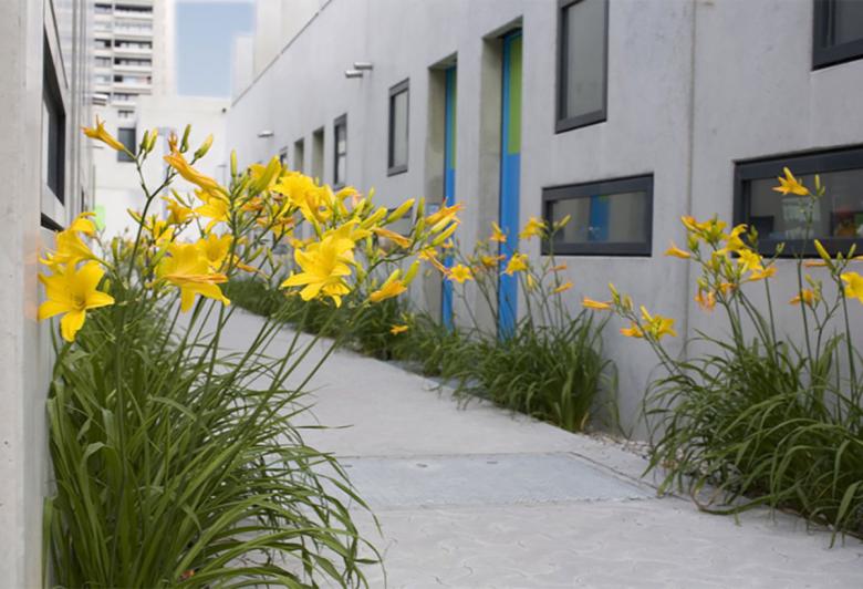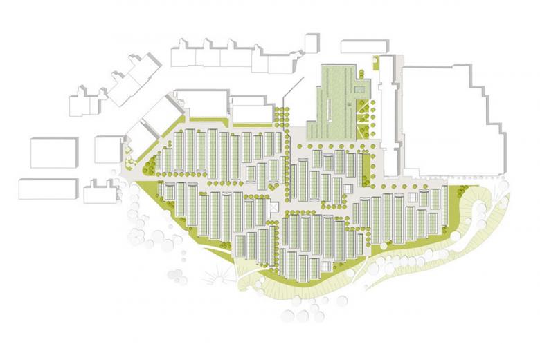 Aufgrund der baurechtlichen Vorgaben und gemäß der ursprünglichen Konzeption kommt die Begrünung eines Großteils der Gebäudedächer hinzu.