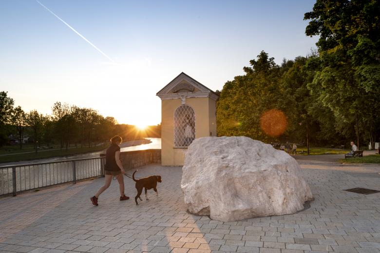 Im Eingangsbereich, nahe der Säggasse, empfängt ein besonders großer Findling als Blickfang die Besucher. Der 4 x 2 x 2 Meter messende und 35 Tonnen schwere Steinblock wurde zuvor bei einem anderen Bauprojekt in Bad Tölz gefunden. Vom Eingang führt eine Promenade entlang des Ufers unter dem prägenden Baumbestand in den hinteren Parkbereich.
