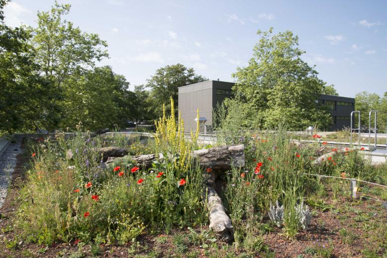 Die Dächer wurden über unser gemeinsames Studienprojekt mit Wildbiene und Partner zur neuen Heimat diverser Wildbienenarten. Auf kleinstem Raum wurden mittels unterschiedlicher Substrate, Saaten und Bepflanzungen unterschiedliche Biotope für die Wildbienen geschaffen: Futterinseln, Wiesen und Überwinterungshügel. Die Flächen dienen dem Hochbauamt Zürich beispielhaft für die Möglichkeiten zur Biodiversitätsförderung am Bau.