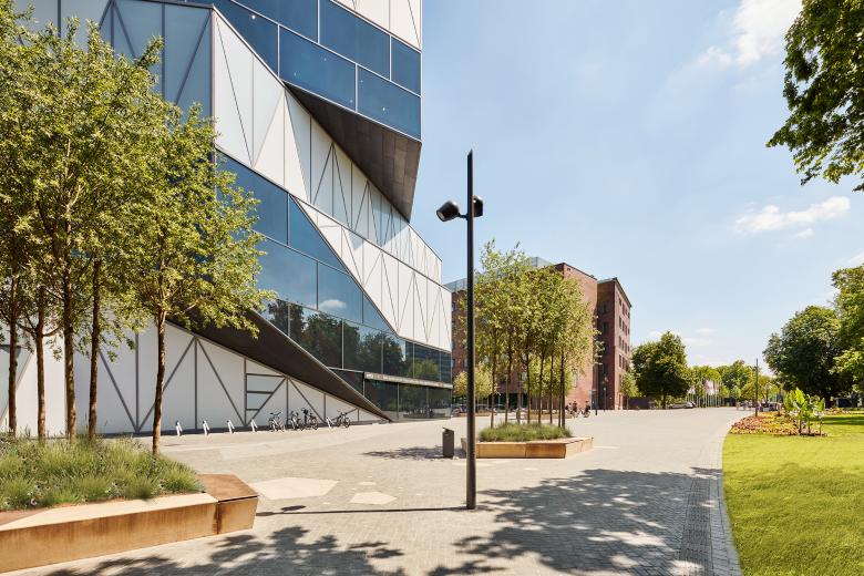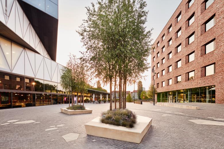 Mit dem Erweiterungsbau des Forschungszentrums Experimenta haben die Außenanlagen auf der Neckarinsel eine neue Raumqualität bekommen. Mit einer großzügigen Geste betten wir das Gebäudeensemble in einen neuen Kontext ein, der die einzelnen Freiflächenbereiche über einen einheitlichen Wege- und Platzbelag verbindet. Die zentralen Platzflächen werden im Norden und Süden von ausgedehnten Wiesenflächen eingerahmt, die den Übergang zum Neckarpark bilden. Baumpflanzungen begleiten die Fußgänger und Fußgängerinnen auf dem Weg zur zentralen Platzfläche, die als Eingangsfläche, Vorfahrt und zur Anlieferung dient und so die optische und funktionale Verbindung zwischen den beiden Gebäuden herstellt. Splitterförmige Intarsien im Platzbelag greifen die charakteristische Formensprache des Neubaus auf. Einige »Splitter« erheben sich dreidimensional aus dem Belag heraus und formen als Sitzelemente einladende Aufenthaltsbereiche unter dem schattigen Blätterdach. Die bodenbündigen Intarsien schreiben die charakteristische Formensprache fort, regen zur vielfältigen Nutzung des Platzes an und integrieren auf außergewöhnliche Art und Weise ein Blindenleitsystem. Am Wasser bilden Sitzstufen einen attraktiven Aufenthaltsbereich in Fortführung der historischen Ufermauern.