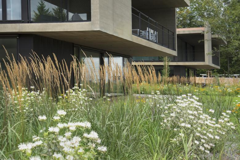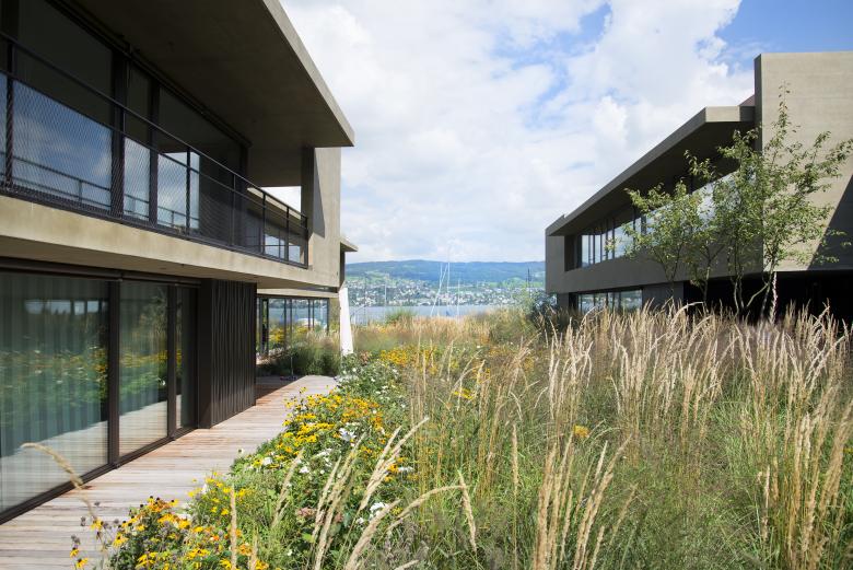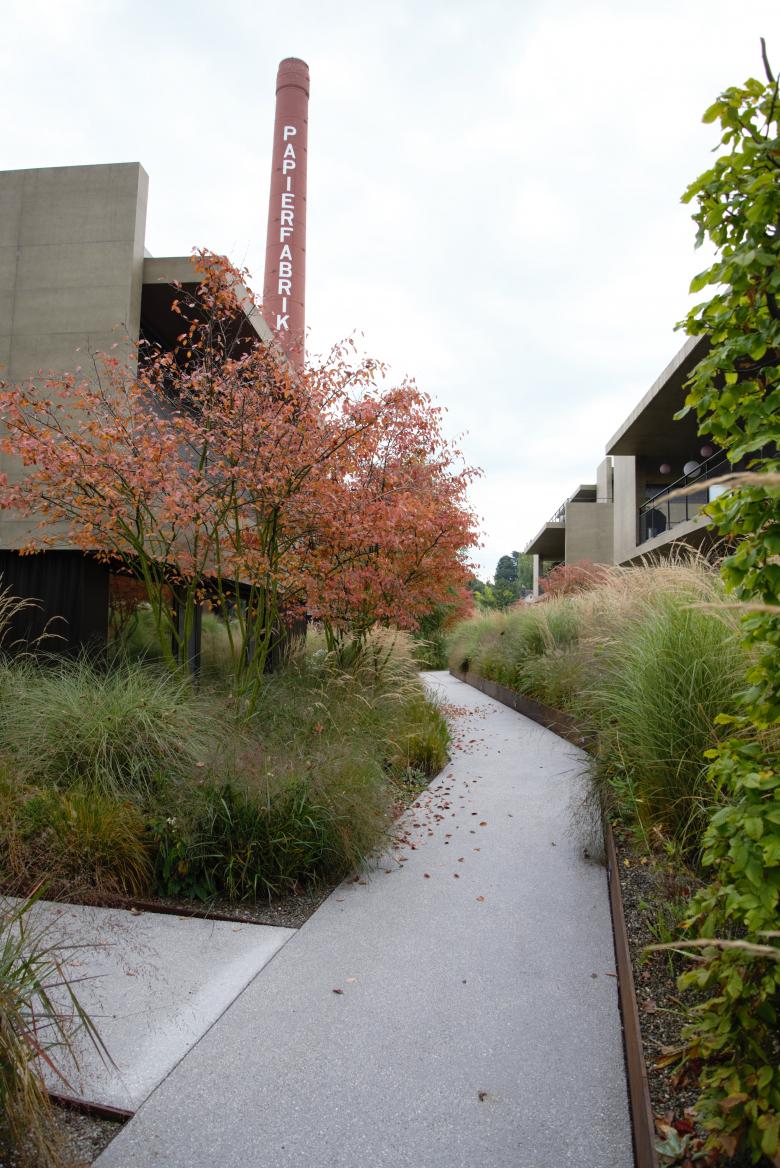 Auf dem Areal der ehemaligen Papierfabrik entstand eine hochwertige Wohnüberbauung mit Ein- und Mehrfamilienhäusern. In der Analyse wurden die Sichtbeziehungen zum See und die Verknüpfung zwischen öffentlichen und privaten Raum in den Vordergrund gestellt. Die grosszügige Bepflanzung mit Stauden und Gräser schafft einen homogenen, feingliederigen Teppich. Privatheit für die Bewohner ist das oberste Ziel, ohne dass das Areal in kleine Einzelflächen zerfällt. Der Öffentlichkeit wurde neu der Zugang zum See mit einem Weg und einer kleinen Grünanlage hinter dem Sporthafen geschaffen. Die Bebauung wird mit einer Weidenpflanzung und einem kleinen Höhenversatz subtil getrennt.