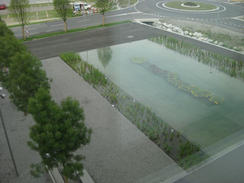 Der Platz zwischen dem bestehenden und dem neuen Verwaltungszentrum des Fenster-, Fassaden- und Türenherstellers 4B bildet ein repräsentatives Entrée. Eine Freitreppe führt auf den erhöht liegenden, zentralen Kiesplatz, auf dem Sitzbänke zum Verweilen einladen, beschattet vom fein gefiederten, im Herbst rotvioletten Laub der Raywood-Eschen. Das grosse Wasserbecken mit Seerosen und Sumpfpflanzen spielt in Form und Bepflanzung mit Geometrien und bricht mit überkommenen Sehgewohnheiten.