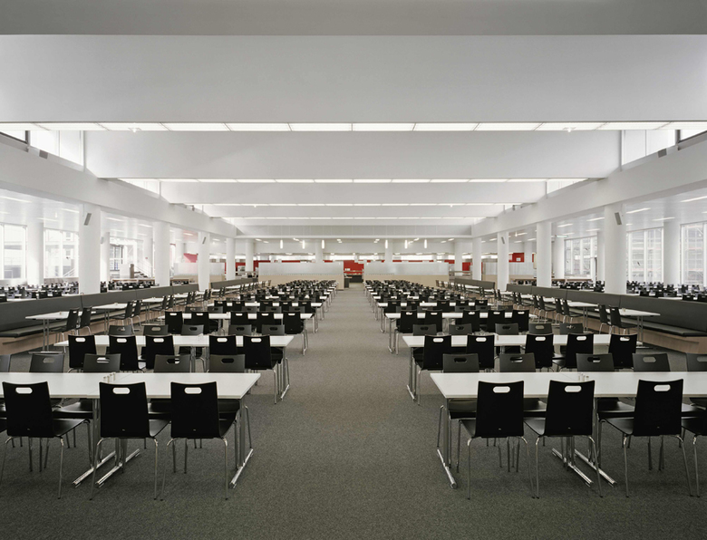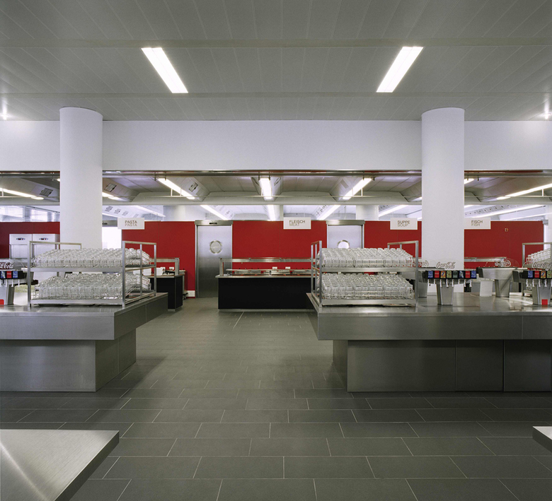 Unter Wahrung der prägenden großzügigen Raumarchitektur (Produktionsküche mit hohem Fensterband zum Straßenraum / zweiseitig belichteter Speisesaal mit Laternengeschoss) wurde die gesamte Baumaßnahme bei fortlaufendem Betrieb in vier Bauabschnitten realisiert.