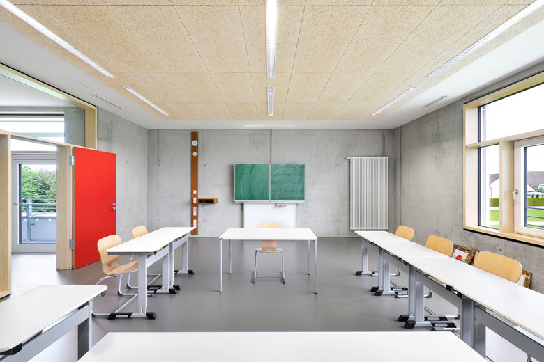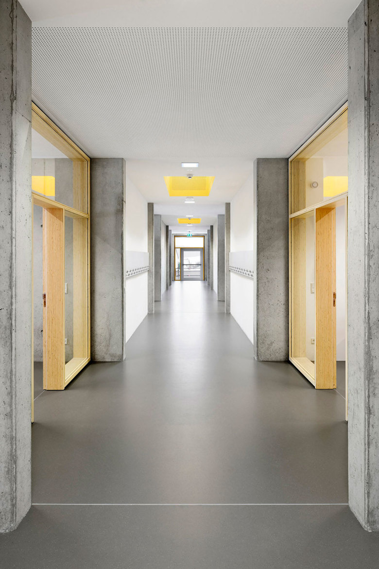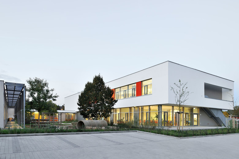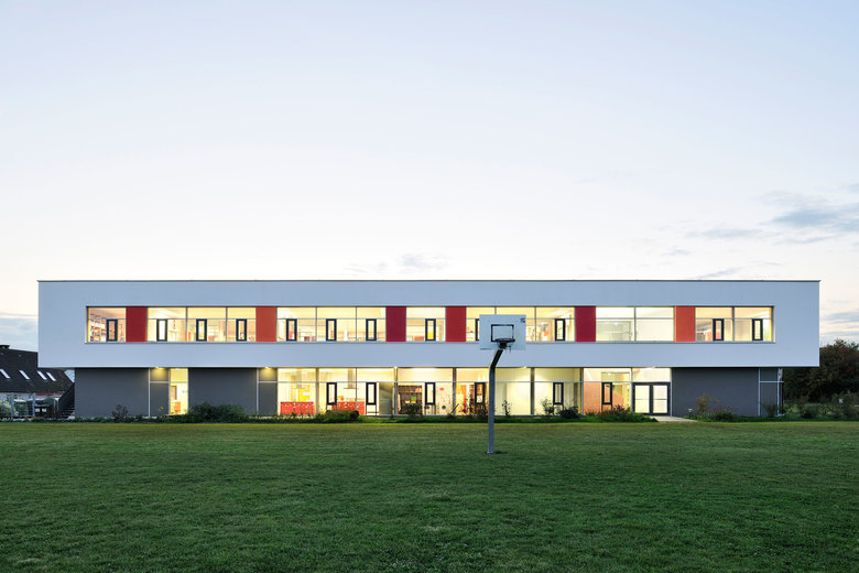 Die vormalig L-förmige, baulich feingliedrige und erdgeschossige Grundschule wird an ihrer Ostseite durch ein kompaktes zweigeschossiges Bauvolumen U-förmig ergänzt.