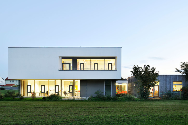 Das neue Bauvolumen schreibt durch seine deutlich zweigeteilte Gestaltung die ursprüngliche Formensprache fort. Ein transparentes Sockelgeschoss mit gläserner Vorhangfassade ergänzt ebengleich das Bestandsgebäude. Darüber schwebt das Obergeschoss als massives, weißes Putzband mit scharfkantig eingefügten, langen horizontalen Fensterschlitzen an den Längsseiten. An den Stirnseiten überkragen die Putzflächen die bauphysikalische Hülle des Gebäudes und schaffen Zwischenzonen, die an der Nordseite Raum für einen Balkon und an der Südseite Raum für eine Fluchttreppe generieren.