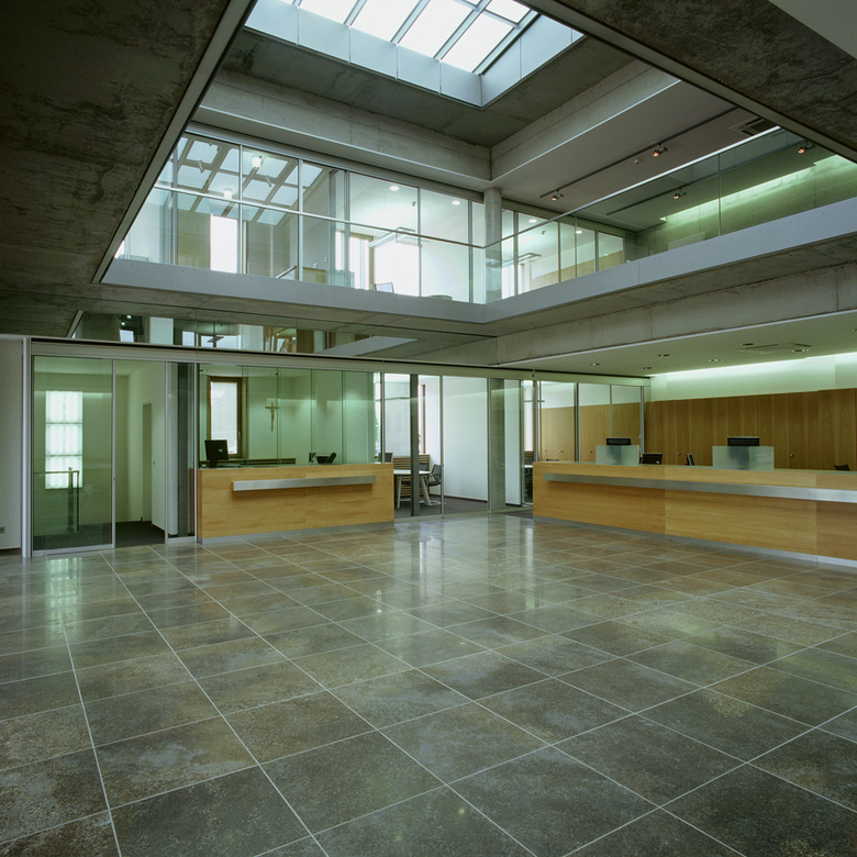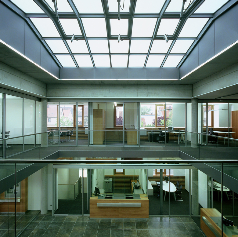 Die Halle im Erdgeschoss dient hauptsächlich dem kurzweiligen 1.Kontakt mit Schaltern Kasse und 2 temporär nutzbaren Beratungsbüros bleibt ansonsten als neutraler Verweilraum von Nutzungen freigestellt. Beratungsintensive Funktionen werden in das neue Obergeschoss verlagert. Alle neuen Büros umrahmen das Atrium als transparente Membrane: gläserne Bürotrennwände garantieren ein Maximum an Transparenz zwischen Halle und Arbeitsbereichen. Die scheinbar über dem massigen Erdgeschoss schwebende gläserne Außenfassade führt den Gedanken der Transparenz in den Straßenraum fort. Eine auskragende Stahl-Gitterrostkonstruktion schützt alle verglasten Seiten wirkungsvoll gegen die Sonne. Massiges Sockelgeschoss und transparentes Obergeschoss reflektieren das klassische fränkische Haus mit Sandstein im Erdgeschoss und Fachwerk im Obergeschoss. In Summe bietet die Raiffeisenbank nun ihren Kunden ein neues Ambiente für erstklassige Beratung in abgerückter Lage.