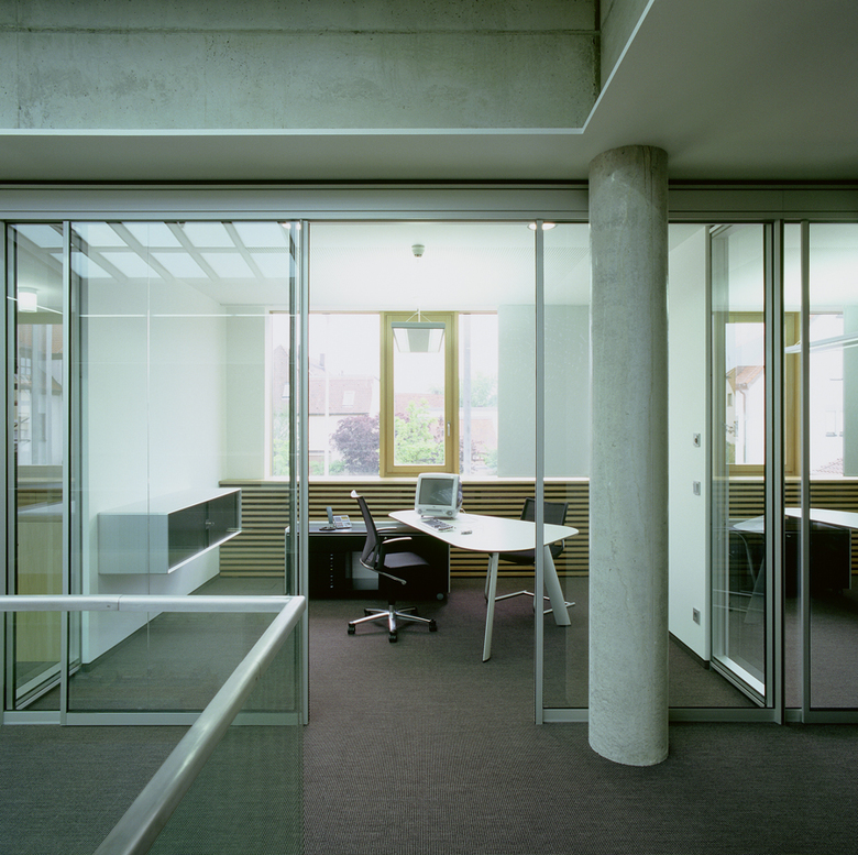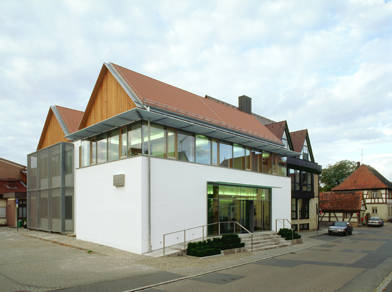 Die Volumenerhöhung der vormals eingeschossigen alten Geschäftsstelle aus den 60er Jahren in der „2.Reihe“ der Innenstadt von Herzogenaurach, behebt gravierende Schwachpunkte des Bankhauses. Städtebaulich verhilft der Anbau mit Aufstockung zu mehr Dominanz im kleinstädtischen Raum. Architektonisch „streckt“ der Neubau den ebenfalls zum Bankhaus gehörenden problematischen Sandsteinbau aus den 80er Jahren als Vertreter heimattümelnder Möchtegern-Sandstein-Architektur. Funktional erhält das Bankhaus einen neuen, attraktiven und höchst einladenden (auch barrierefreien) Eingang. Der alte Kundenbereich im Erdgeschoss wird entkernt und um ein transparentes Geschoss aus Stahl und Glas mit gliederndem Satteldach aufgestockt. Im neuen Innenraum werden Erd- und Obergeschoss durch eine große Öffnung zum Atrium verbunden und mit Tageslicht versorgt. Die vertikale Erschließung erfolgt über bestehende Treppenhäuser.