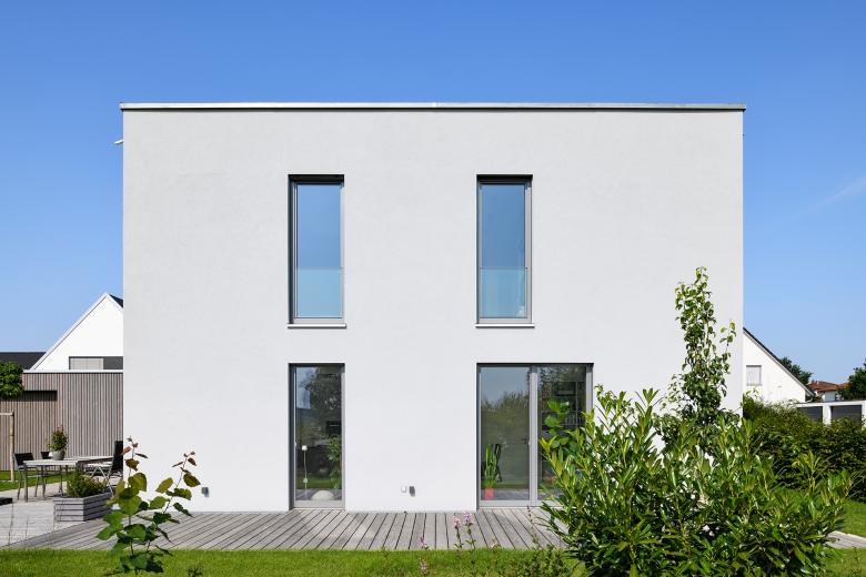 Zum Garten verknüpfen die Fensteröffnungen innen und außen, im Obergeschoss erfolgt die Anordnung der Öffnungen möglichst unter Vermeidung nachbarlicher Einblicke.