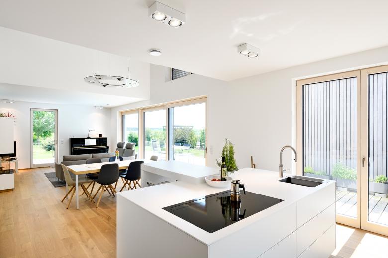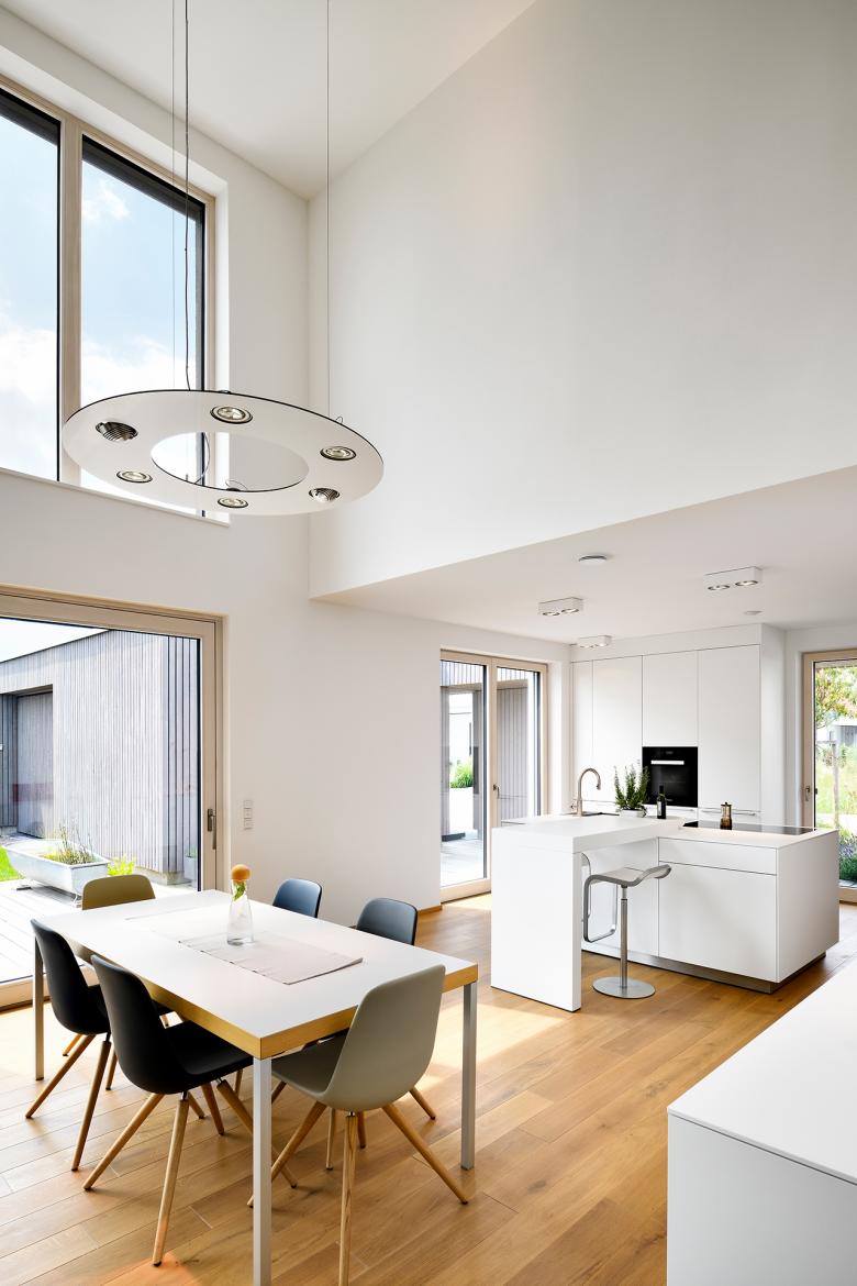 Die reduzierte Formensprache der Gebäudehülle wird im Innenraum fortgeführt. Hier dominieren Einbauschränke, weiße Wände, raumhohe Wandöffnungen und durchgehend einheitliche Bodenbeläge.