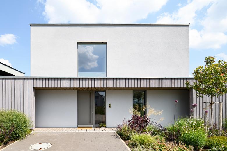 Den Auftakt bildet die den Straßenraum abschließende erdgeschossige Erschließungsspange für Vorzone mit Eingang, Lager und Garage, eingehüllt in eine stehende Lärchenschalung. Im Gartenbereich zurückgesetzt und so sichtgeschützt zum Strassenraum ist das zweigeschossige Wohnhaus platziert, jetzt mit verputzter Fassade.