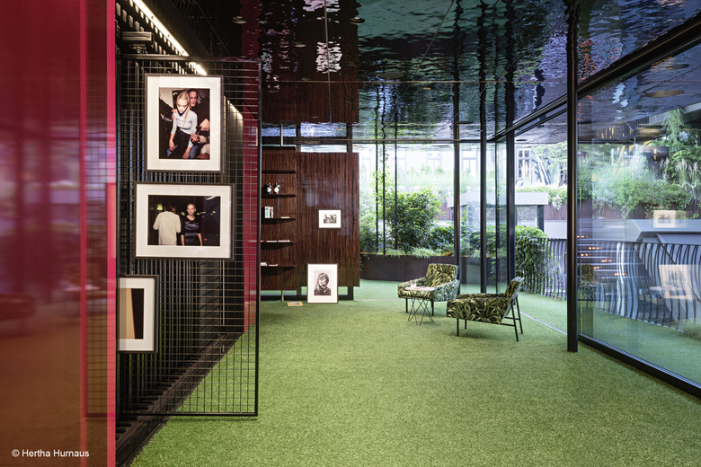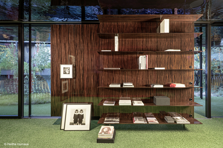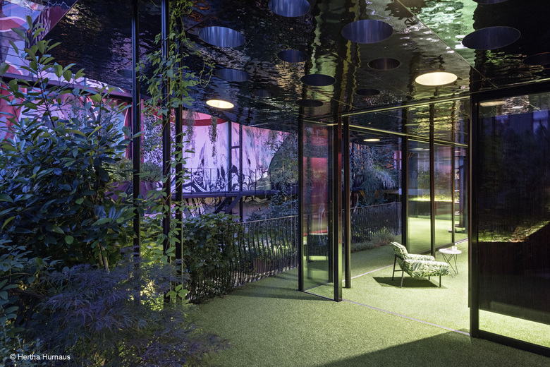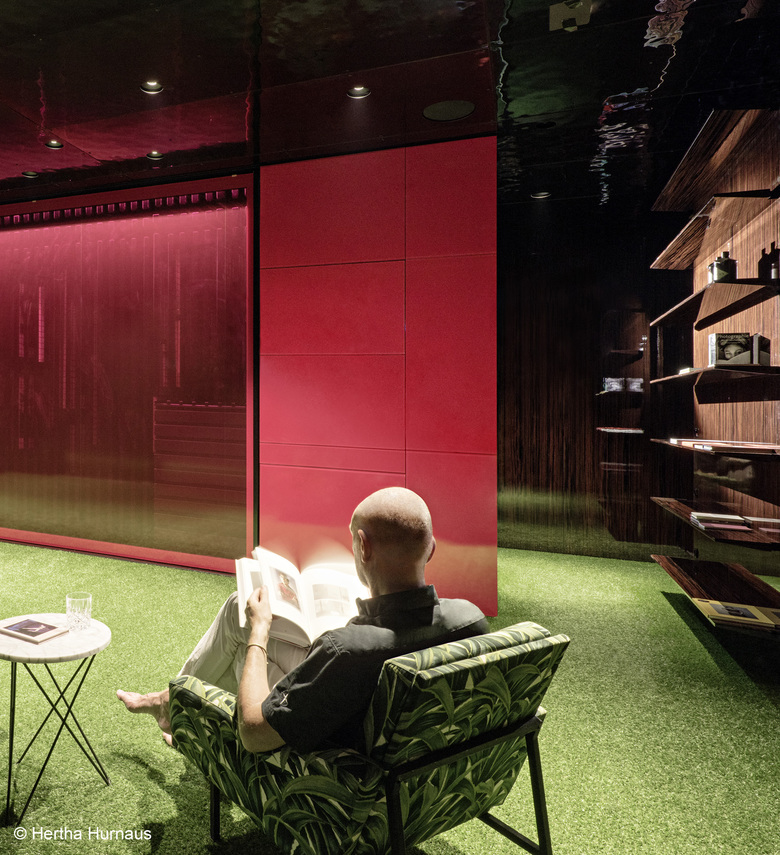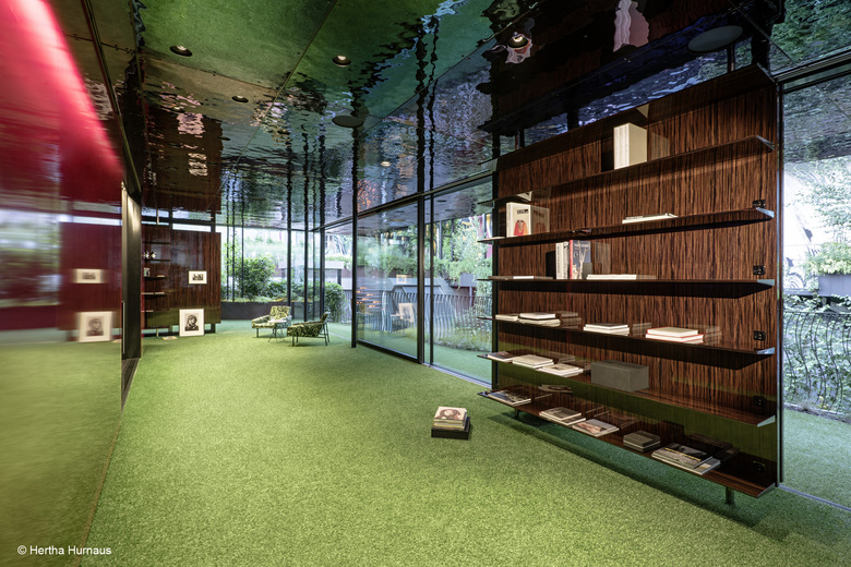 A minimalist cubicle in a striking, vivid flame red colour has been placed as a shelter for an art and photography collection. Enhanced by the glass, the colour brings light and animates surroundings with reflections and brilliance. A continuous flooring covered with lime-green artificial grass allows to completely open up the interior to the outdoors and truly blend them together. The ceiling made out of stainless steel panels with a mirroring and slightly wavy surface adds the finishing touch to the unique ambience. It reflects a fragmented image of the surroundings, giving the optical effect of gently rippling water.