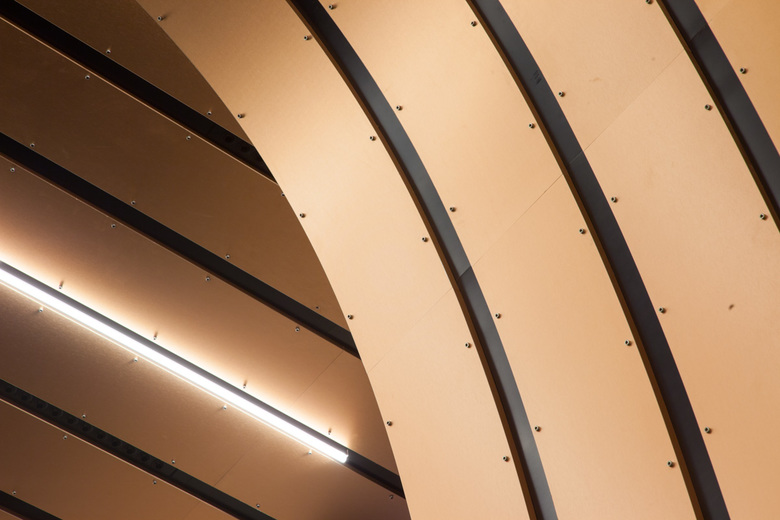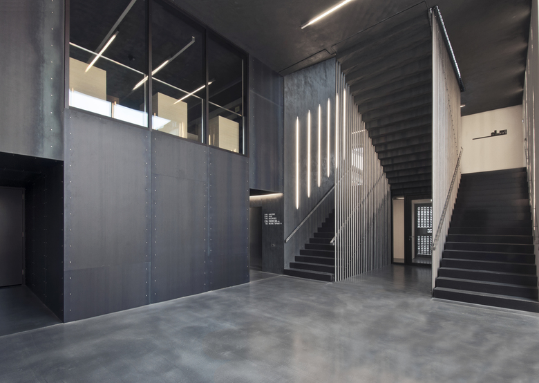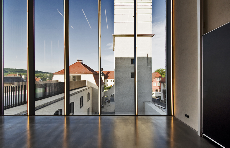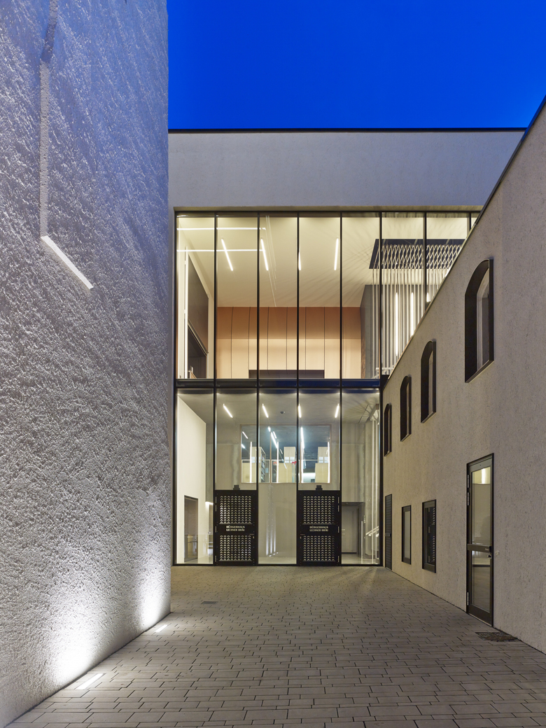Die frühere Nutzung ist auch in der Materialität des neuen Bürgerhauses spürbar: Kupfer, Edelstahl, blanker warmgewalzter Stahl, Kellenwurfputz und einfache Materialien aus dem Industriebau dominieren. Der neue Putz, ein mineralisches Putzsystem mit handwerklichen Spuren, orientiert sich auf Grundlage des ursprünglichen Putzes am Turm, am historischen Vorbild und zieht sich einheitlich über alle Fassaden. Die Architekten Christian und Peter Brückner bringen die materielle Vielfalt auf den Punkt:
