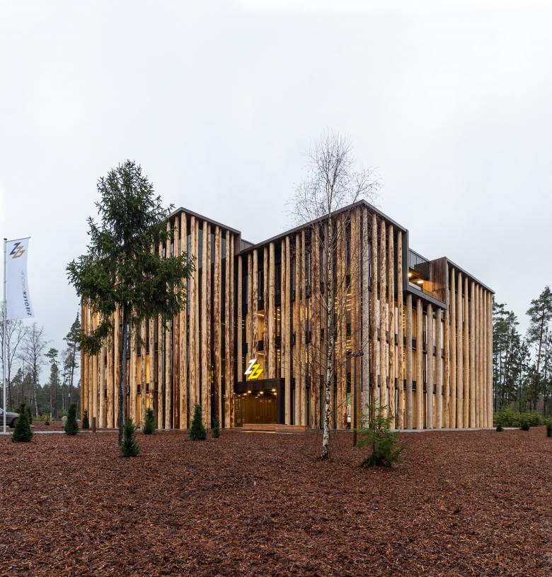 Mitten auf einer Lichtung im Wald wächst ein neues Haus aus dem Boden. Ein Spiel aus Licht, Schatten und Holz. Ein Haus wie ein Wald. Ein Haus für die zentrale Verwaltung der Ziegler Group. An einem selbstverständlichen Ort, dem Ort, an dem 1948 die Erfolgsgeschichte des Familienunternehmens mit dem Sägewerk Betzenmühle begann. Aus selbstverständlichem Material – innen wie außen, dem Material mit dem sich das Unternehmen tagtäglich beschäftigt. Unsere Architektur zeigt das Unternehmen, die Ziegler Arbeitswelt, seine Produkte und seine Philosophie.