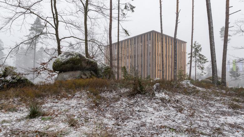 Es begann mit einem Anruf vor drei Jahren. Gemeinsam mit den Bauherren haben wir uns dann auf Spurensuche im Wald rund um das Sägewerk begeben und gefragt, was soll hier wachsen und wo? An der Schnittstelle von Wald und Produktionsflächen, am höchsten Punkt des Areals sind wir fündig geworden. In gemeinsamen Workshops wurde eine Idee geboren: Wir nehmen das ursprünglichste Produkt der Ziegler Produktpalette, den Baumstamm, Fichte bis zu 19 Meter hoch und bauen ein Haus daraus. Spielen schon von außen auf der Partitur der Ziegler Produkte, die Langhölzer rhythmisch aufgereiht, ziehen sich um das Gebäude wie auf Notenlinien. Holz als natürlicher Filter, Diskretion von Innen und außen, zusätzlich verschattbar mit einem textilen Sonnenschutz, im Kern eine Pfosten-Riegel-Fassade aus Glas, Holz und Aluminium. Die beiden Kuben sind in der Höhe versetzt, wie bei einem Baumstumpf mit Fällschnitten, dazwischen zwei Innenhöfe, die die Lichtung symbolisieren. Jeder Mitarbeiter sitzt so an einem Fenster.
