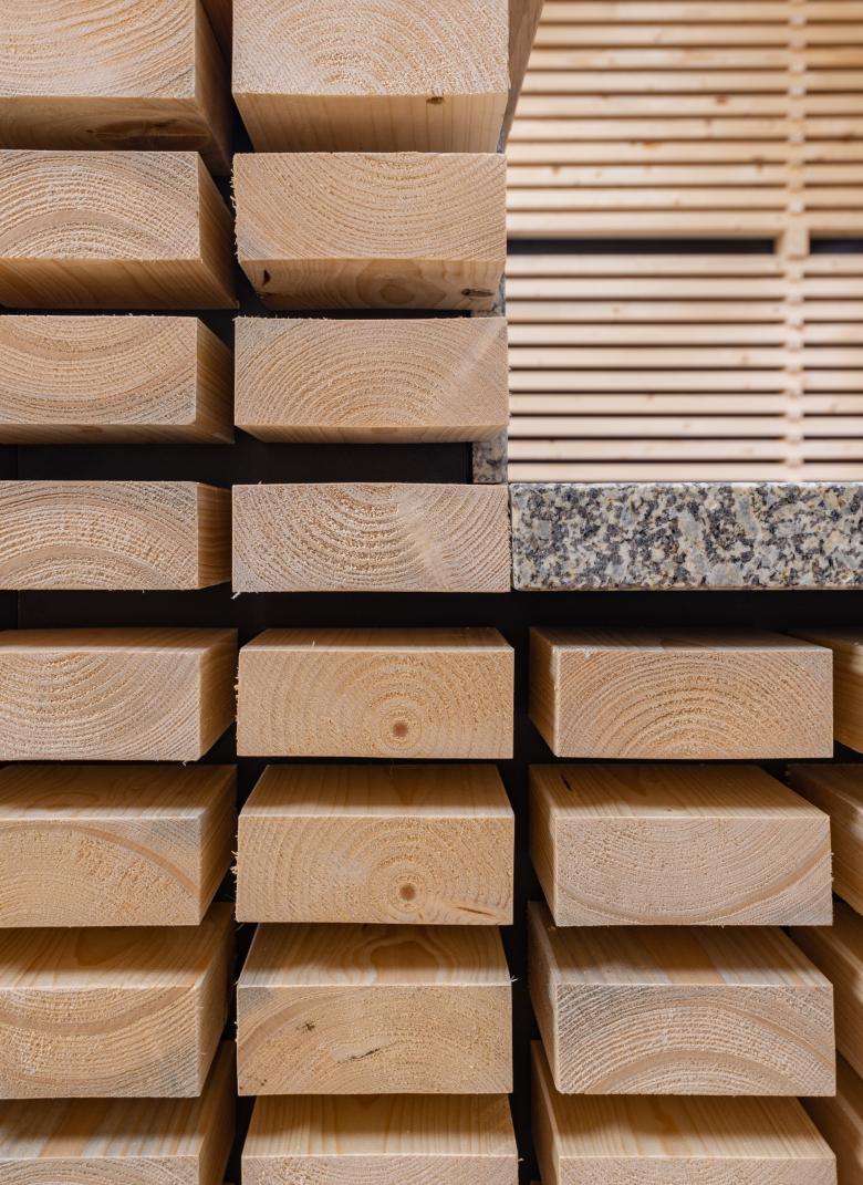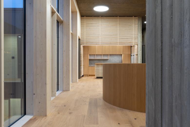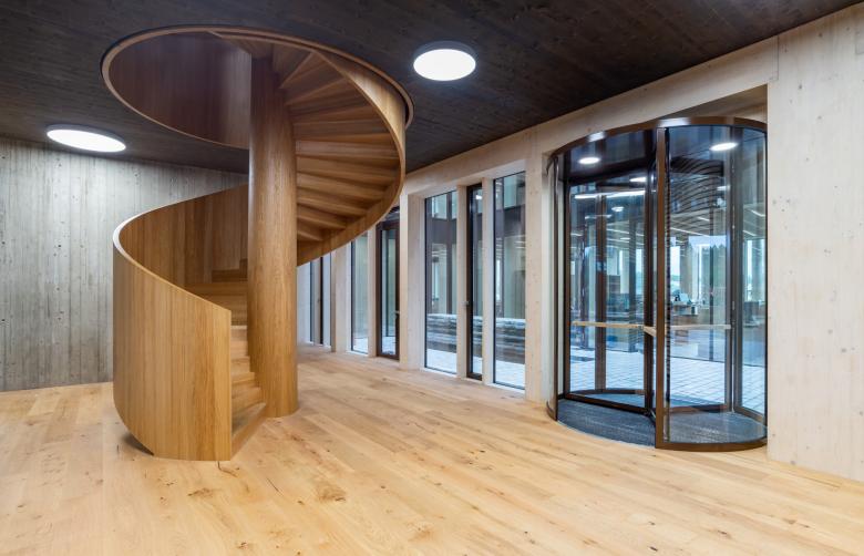 Innen setzt sich dieses Konzept fort, die Verarbeitung des Holzes wird immer feiner und das Haus zeigt alle weiteren Verarbeitungsschritte des Holzes von Theken aus rauem Brettschichtholz bis hin zu den veredelten Holzoberflächen bei den Büromöbeln. Holz in seiner ganzen Vielfalt in Verarbeitung, Sorte und Farbigkeit. Das neue Verwaltungsgebäude ist ein reiner Holzbau mit Brettsperrholzwänden und zwei Fluchttreppenhäusern aus Beton, ebenfalls holzsichtig. Ziel war es auch, den Baustoff Holz konsequent weiterzuentwickeln und zeitgemäße Antworten für seine Verwendung zu finden.