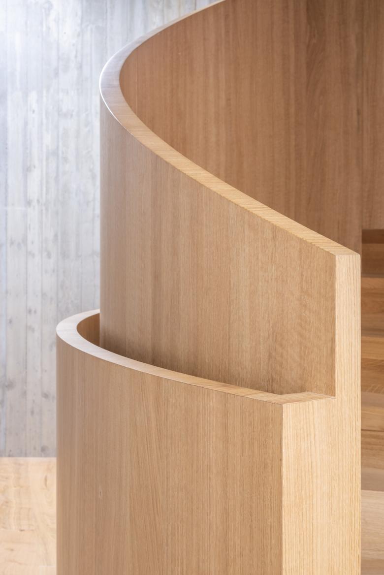 Das Haus verbindet, stiftet Identität und schafft eine perfekte Arbeitsatmosphäre – Verwaltung und Produktion immer in Blickbeziehung. Es war dem Bauherren wichtig, dass alle miteinander arbeiten, Kommunikation, Transparenz, Durchblicke, zu den Kollegen und in die umliegenden Wälder. Neben einem Showroom, den Büros für etwa 100 Mitarbeiter, Besprechungsräumen, einer Loggia, gibt es ein Mitarbeiterrestaurant und ein Gästekasino, alles verbunden durch eine hölzerne Wendeltreppe.