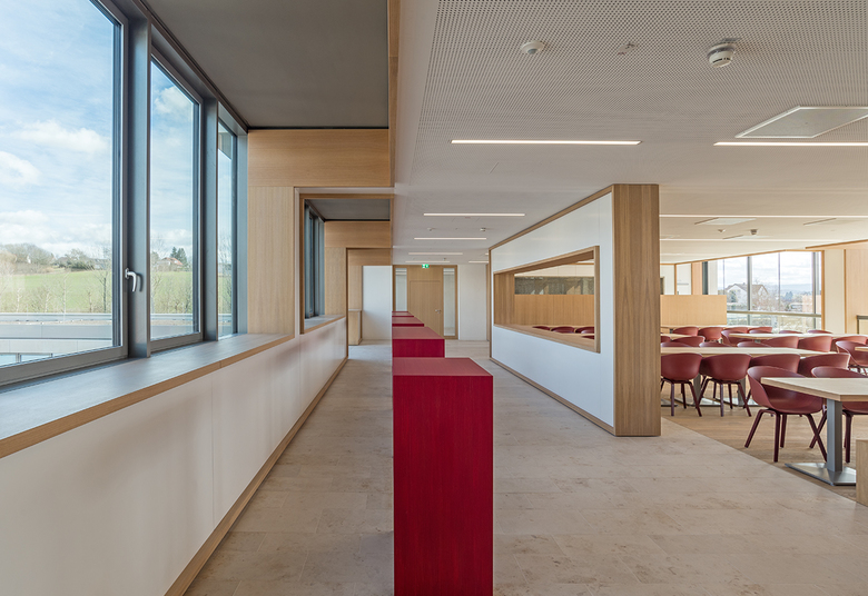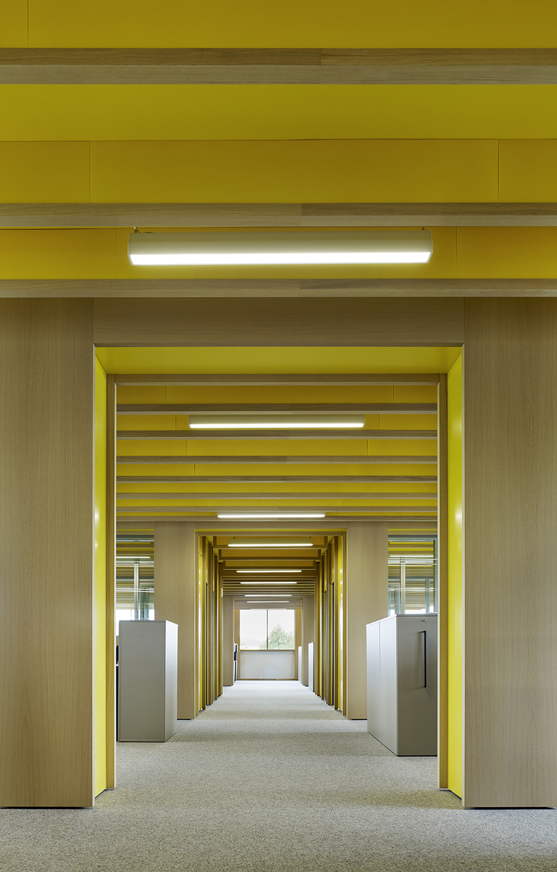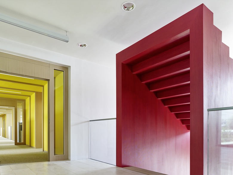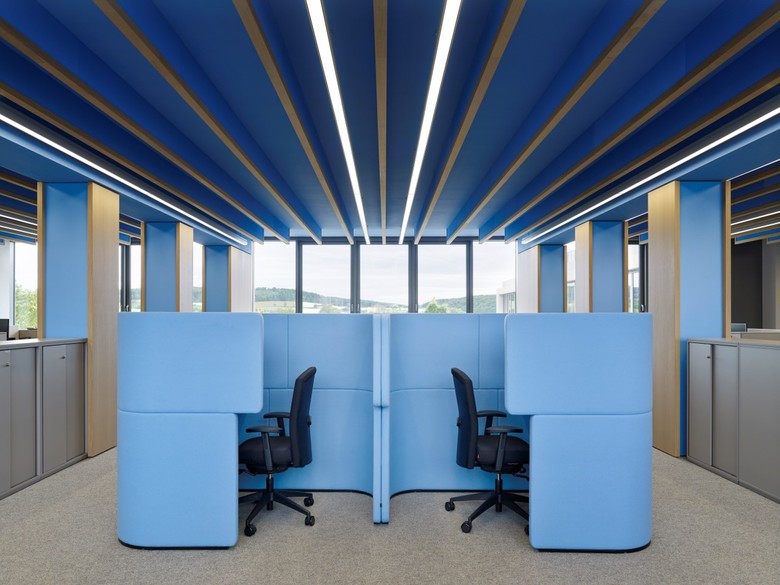 Die Vielfalt der Farbe zeigt sich im Inneren und ist in ihrer Dreidimensionalität auch außen spürbar, leuchtet aus dem Innersten des Gebäudes heraus. Das Foyer formt ein transparentes Portal, erlaubt Einblicke und Durchblicke. Ein Schaufenster zur Produktion. Raum für Kommunikation. Ein multifunktionaler Ort der Begegnung. Eine Farbskulptur heißt willkommen, lädt zum Verweilen oder Besprechen ein. Die Geste der Zukunft zieht sich als handwerklicher, kraftvoller roter Pinselstrich in Form eines Foyermöbels durch den Raum, verbindet alles. Ein Bogenschlag zwischen traditionsreichem Handwerk und innovativer Weltindustrie. Die Farbidee begleitet durch das ganze Gebäude, ist dabei aber nie additiv sondern nimmt sich in ihrer In-tensität zurück, geht eine Symbiose mit der Architektur ein, bietet Orientierung. Jede Abteilung hat ihre eigene Farbe und Identität. Farbwelten. Arbeitswelten. Begleitet von hellem, warmem Eichenholz und Blicken in die umgebende Natur.
